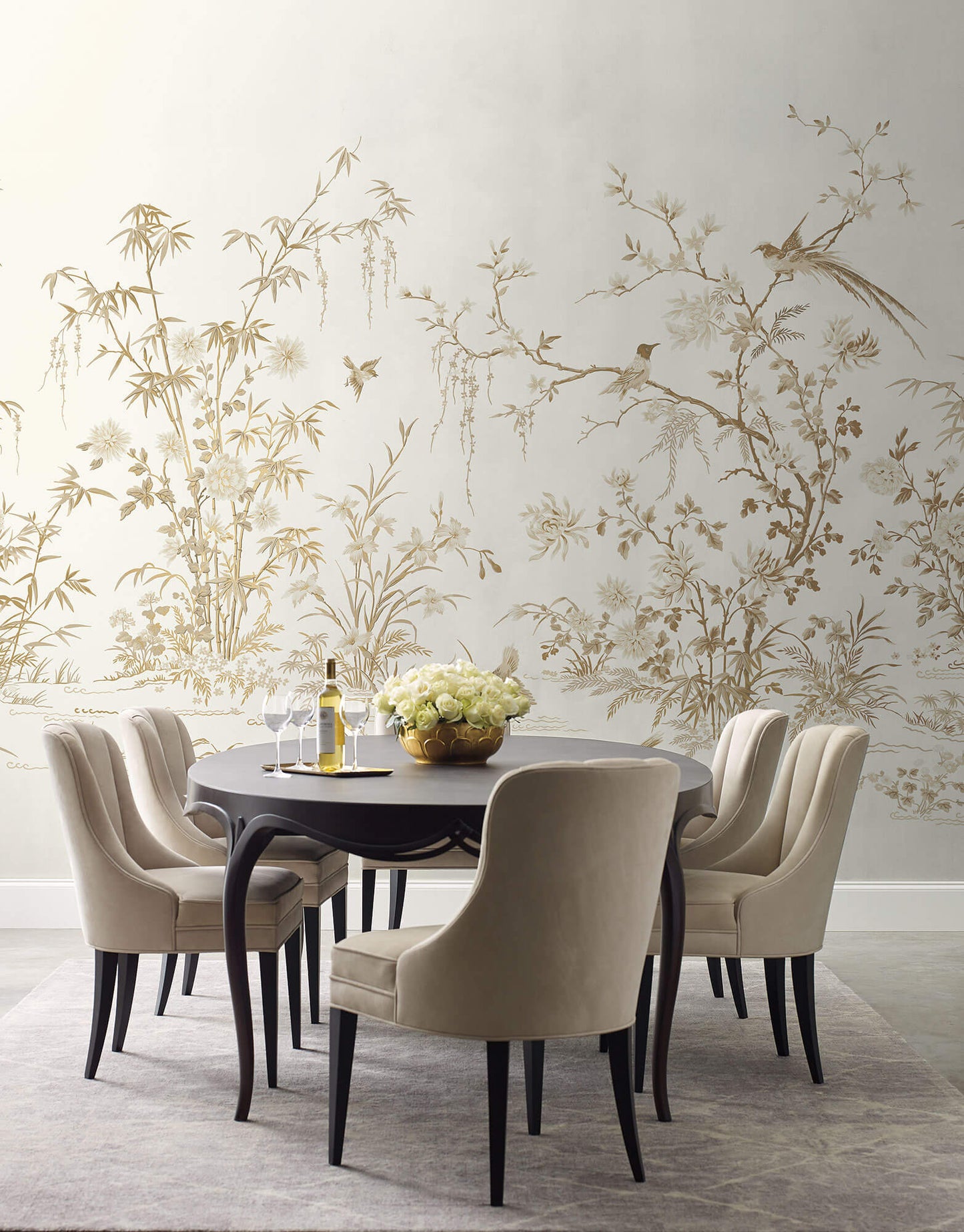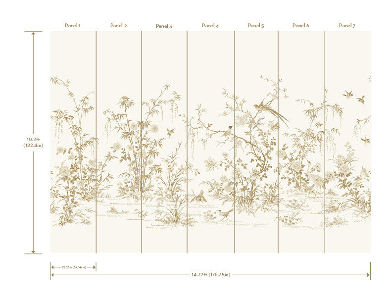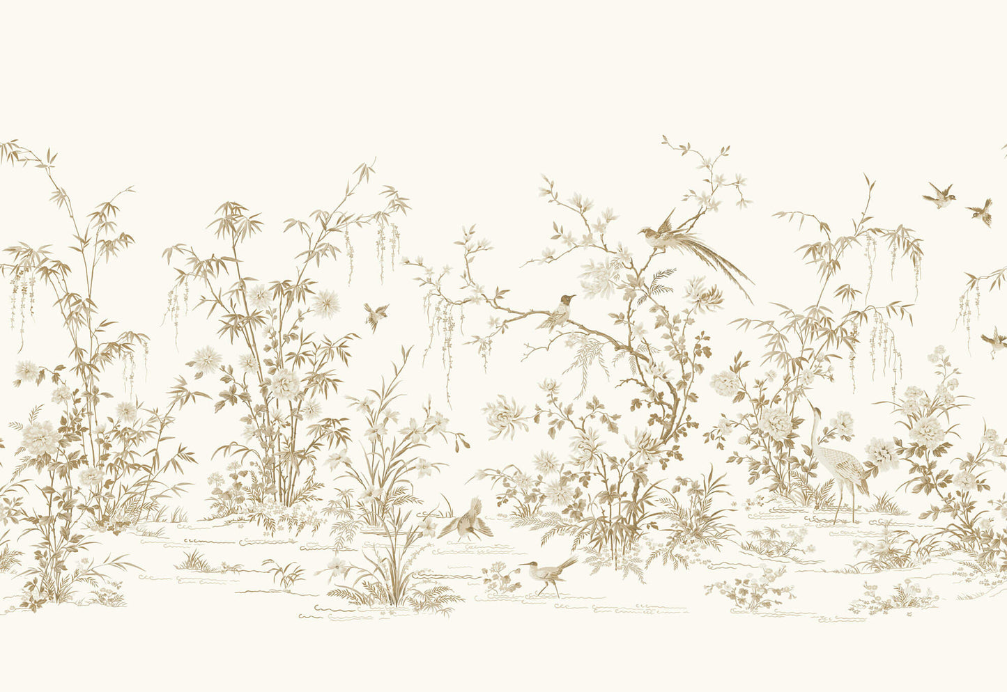 The Asian scenic landscape of a wetland's botanicals and birds flourish against a backdrop of majestic metallic shimmer in Flowering Vine Chinoiserie wallpaper mural. The Ronald Redding 24 Karat collection exemplifies this blend of quiet sophistication and fine quality with the glamour of modern urban living.