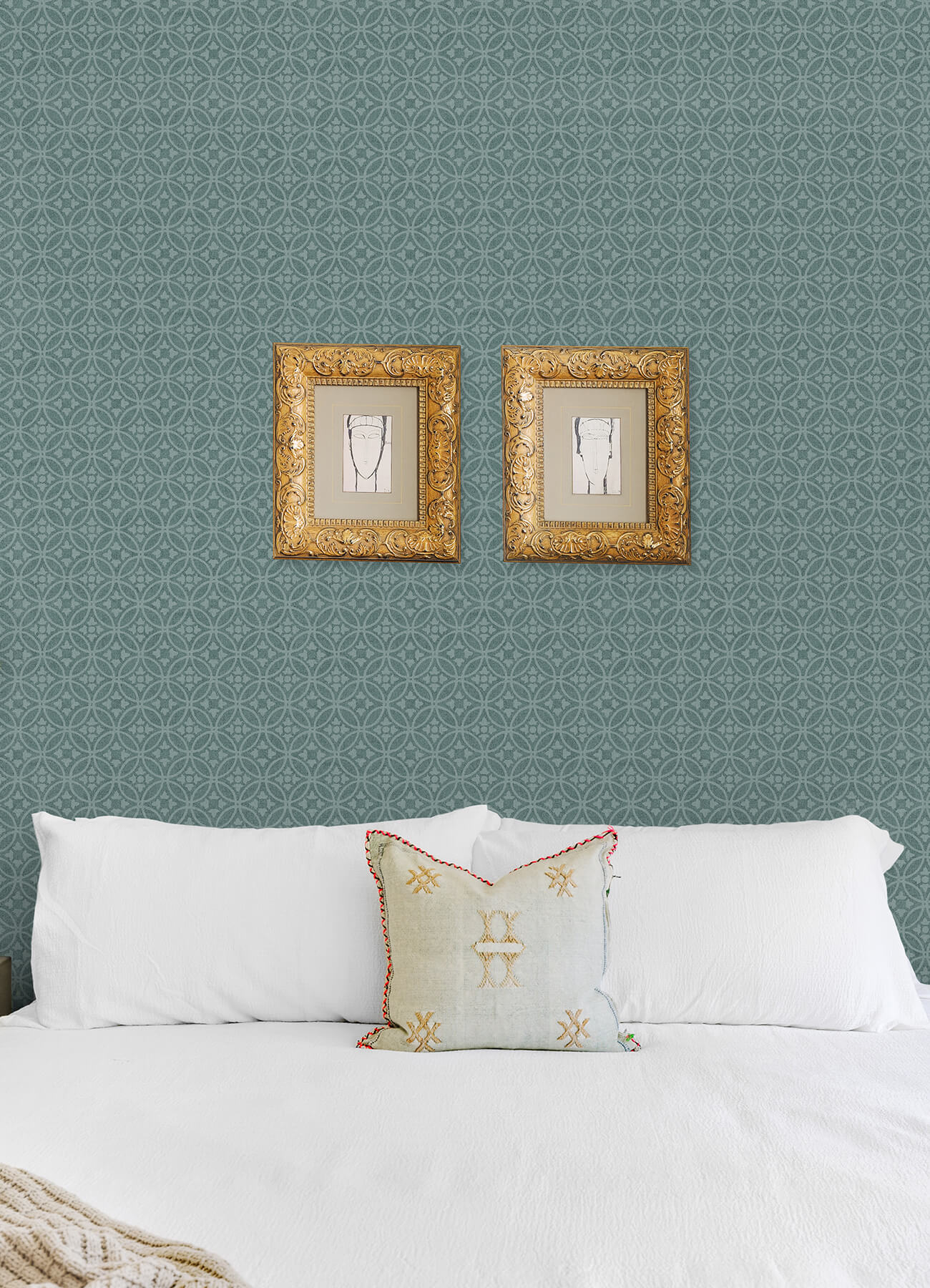 Bring craftsman charm to your walls with this retro-inspired geometric design! A dark teal backdrop is layered with lighter teal overlapping circles, each embellished with a simple floral stamp. Larsson is an unpasted, non woven wallpaper. Decorate your home with the timeless, natural beauty of Revival by A-Street Prints. Celebrating rich ornamentation and masterful craftsmanship, this wallpaper collection is filled with a variety of artistic botanical designs and intricately styled geometric patterns that bring character and charm to your interior.