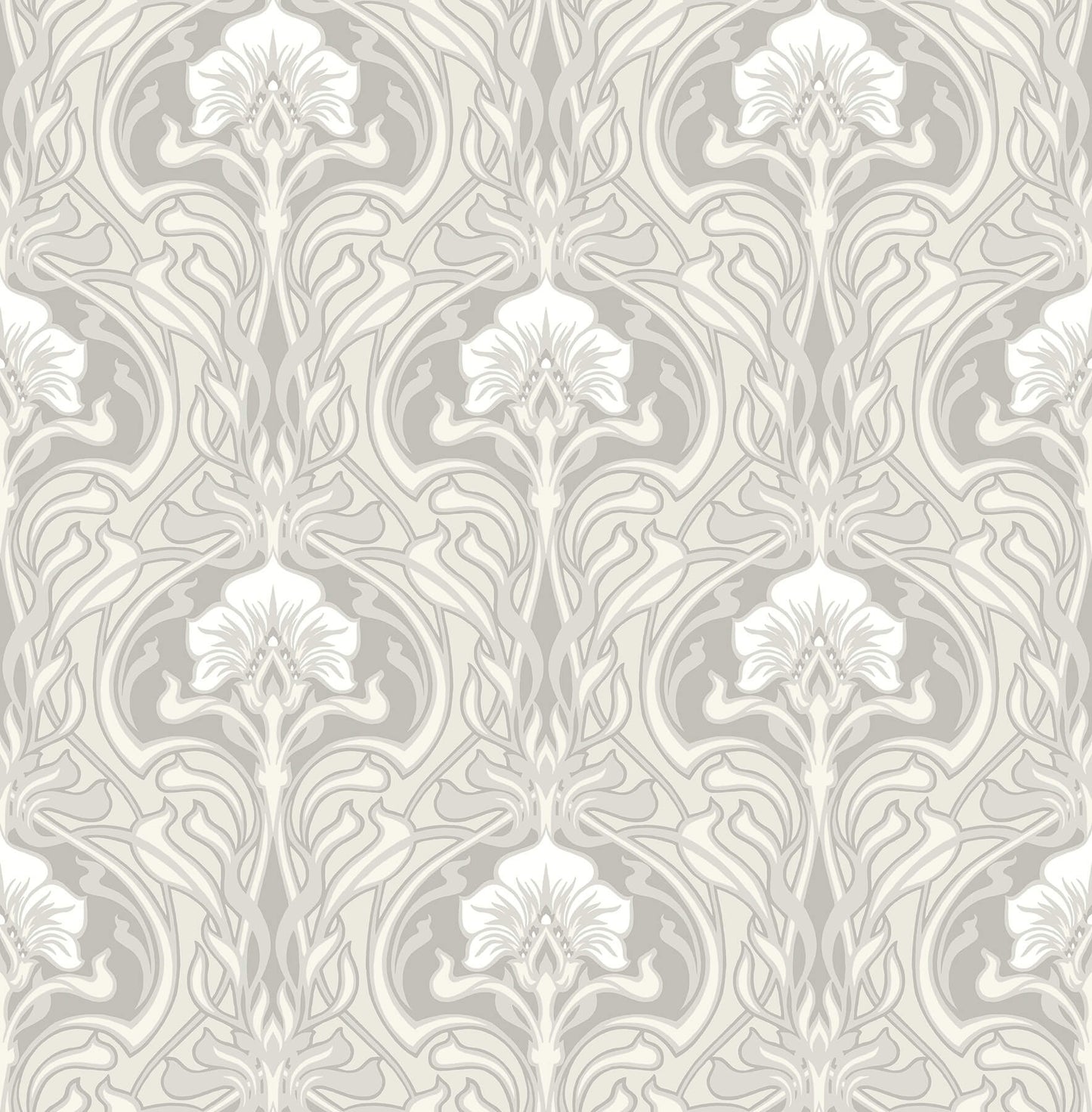 Amp up the drama in your space with this gorgeous, Art Nouveau-inspired floral wallpaper! The white, five-petaled blooms are surrounded by a curved and intricate weaving of vines accented with a silver sheen. The cool grey and white color palette adds an extra bit of sophistication to this design. Mucha is an unpasted, non woven wallpaper. Decorate your home with the timeless, natural beauty of Revival by A-Street Prints. Celebrating rich ornamentation and masterful craftsmanship, this wallpaper collection is filled with a variety of artistic botanical designs and intricately styled geometric patterns that bring character and charm to your interior.