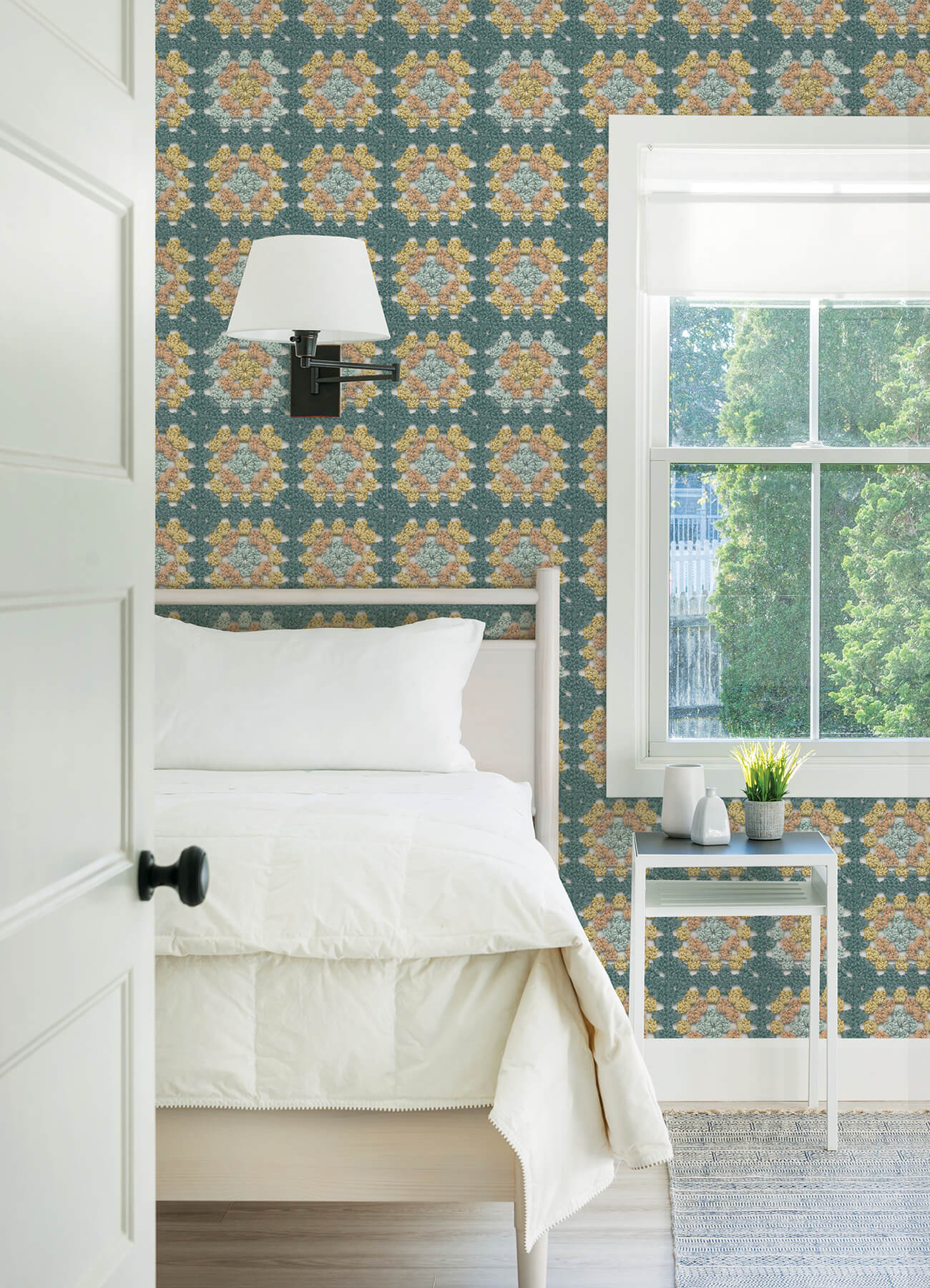 Create a space that radiates the comfort of a hand-crocheted afghan! Teal, coral, and mustard inks create the look of a classic granny square over a white background. Maud is a prepasted, non woven blend wallpaper. Enjoy the warm and welcoming ambiance of the natural world with Thoreau by Chesapeake. From classic designs with a modern twist to more contemporary comforts, this collection will bridge the gap between the great outdoors and the comforts of home.
