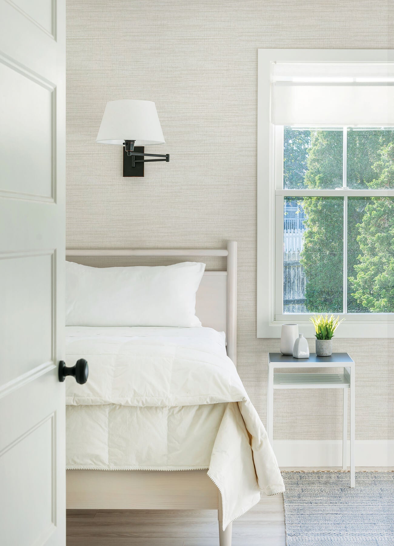Elevate your space with the subtle dimension of this textural wallpaper. Grey striations create a woven look across a soft white backdrop, raised inks adding a subtle texture to this design. Solitude is a prepasted, non woven blend wallpaper. Enjoy the warm and welcoming ambiance of the natural world with Thoreau by Chesapeake. From classic designs with a modern twist to more contemporary comforts, this collection will bridge the gap between the great outdoors and the comforts of home.