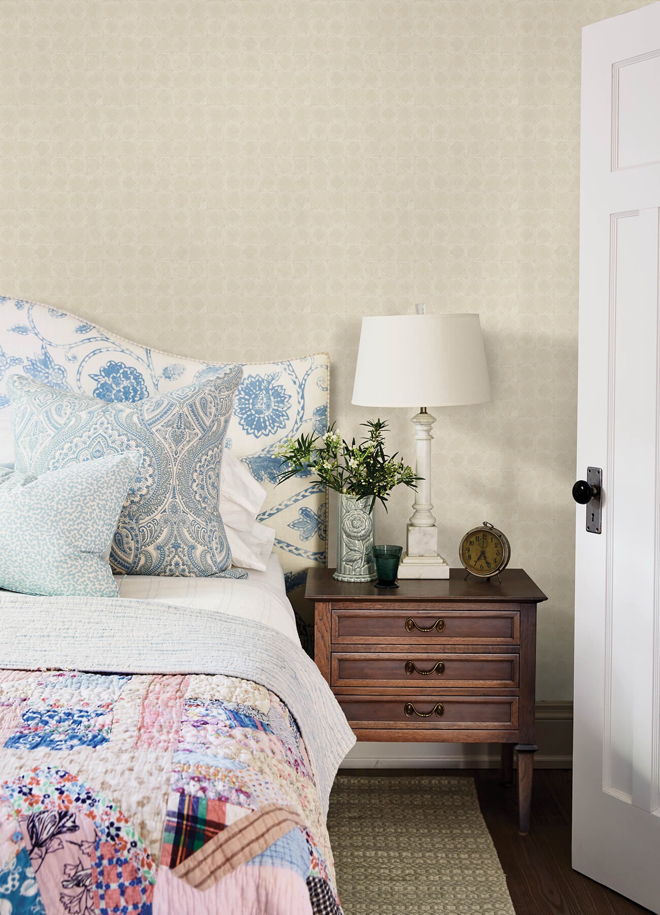 With the comforting appeal of a hand-made quilt, this geometric wallpaper features pale taupe squares embellished with simple white detailing. Button Block is a prepasted, sure strip wallpaper measuring 20.5 inches wide by 33 feet long, covering approximately 56.4 square feet per roll. Chesapeake wallpapers are classically beautiful. Each collection centers around a thematic influence, using familiar motifs and versatile prints to capture the essence of styles like coastal chic, French country, rustic charm, and traditional elegance. The high quality patterns are designed to be enduring and timeless.