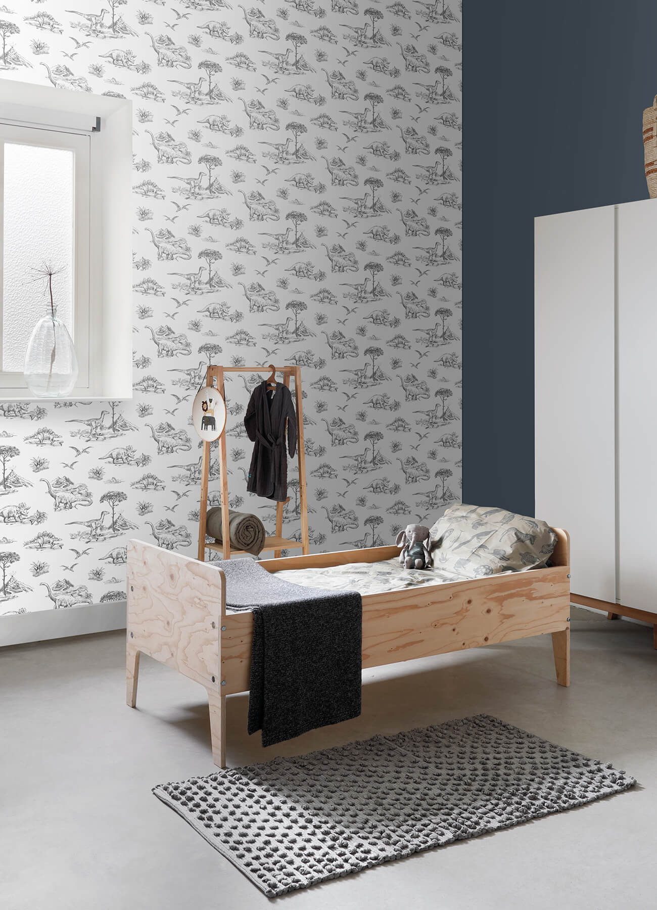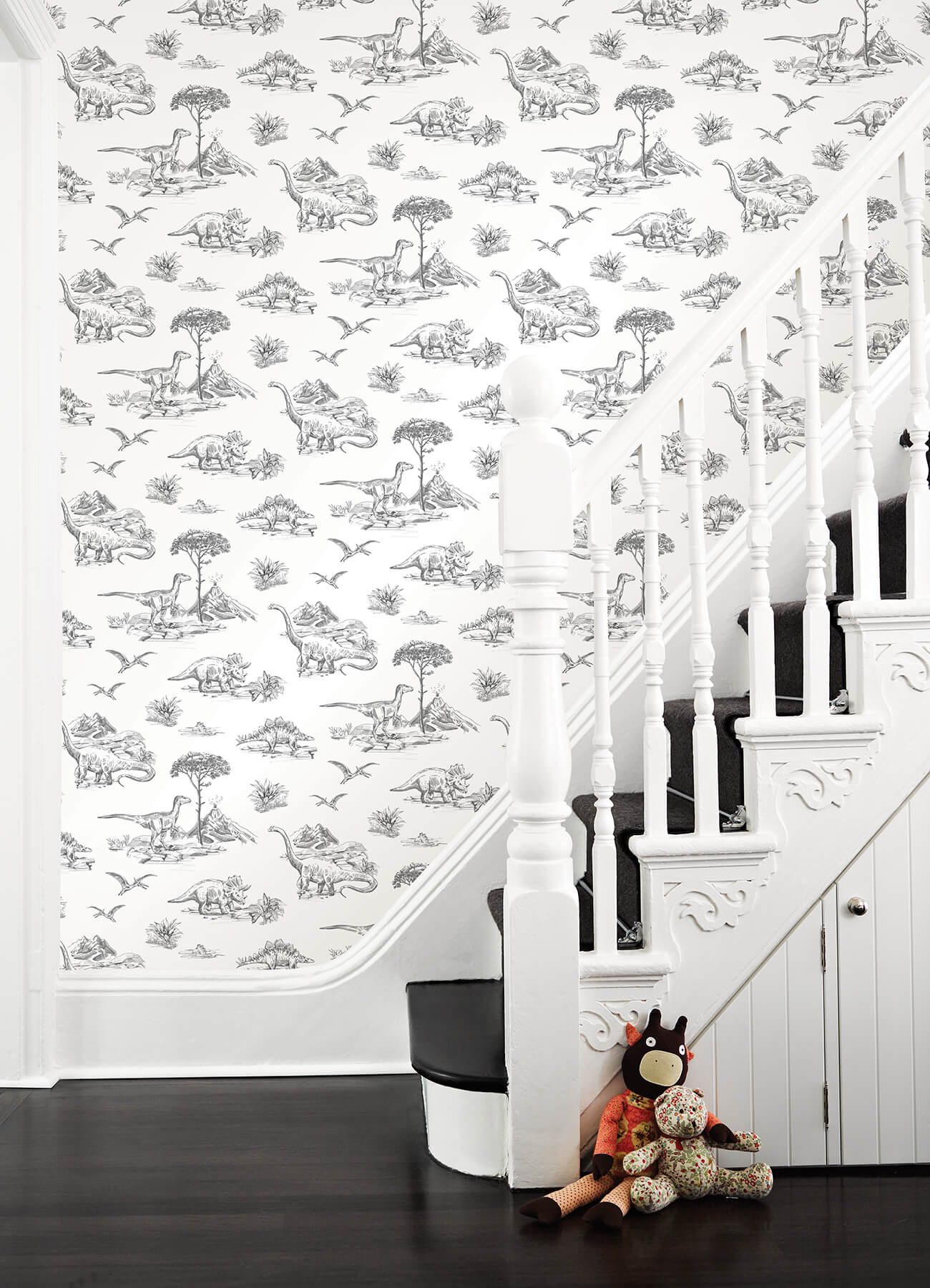 Take a trip to the Triassic period with this illustrative print! Dinosaurs prowl land and sea, sketched in grey inks along a crisp white background. Isolde is an unpasted, non woven wallpaper. Inspire curiosity and joy with the imaginative stylings of Fable by Chesapeake. From whimsical woodland scenes to butterfly gardens and fun novelty prints, this collection features imaginative prints for every child's space.