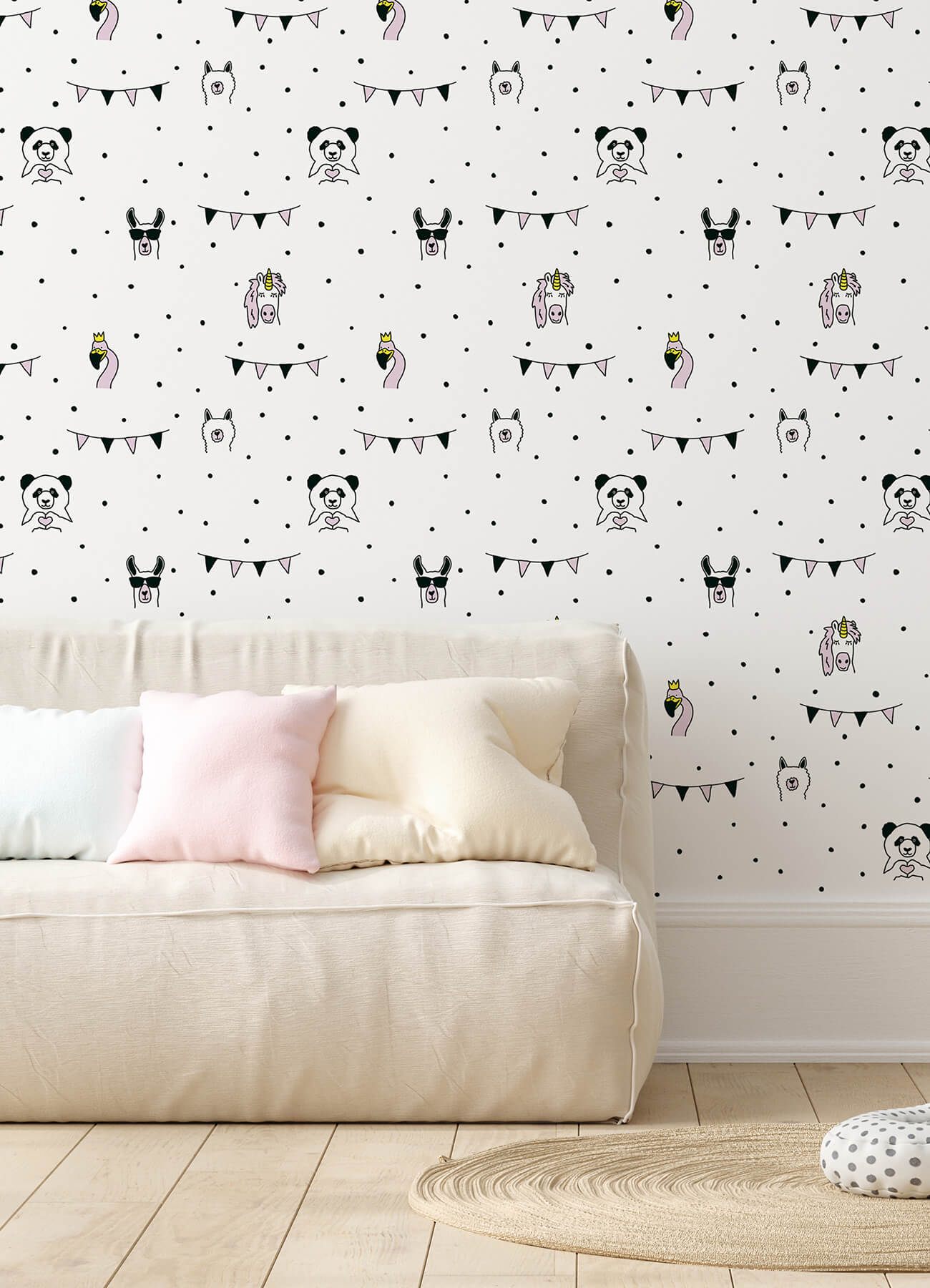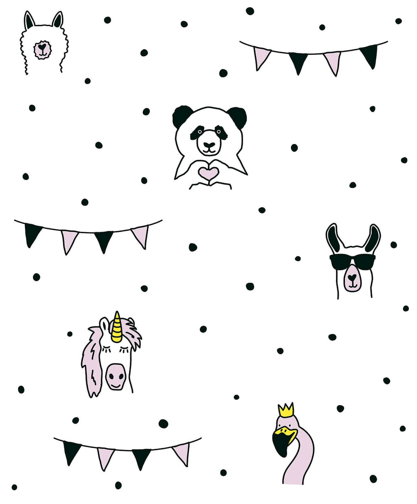 Let your inner party animal out with this festive animal print! Pink llamas, flamingos, unicorns and pandas are surrounded by decorative banners and black dots. Orlow is an unpasted, non woven wallpaper. Inspire curiosity and joy with the imaginative stylings of Fable by Chesapeake. From whimsical woodland scenes to butterfly gardens and fun novelty prints, this collection features imaginative prints for every child's space.
