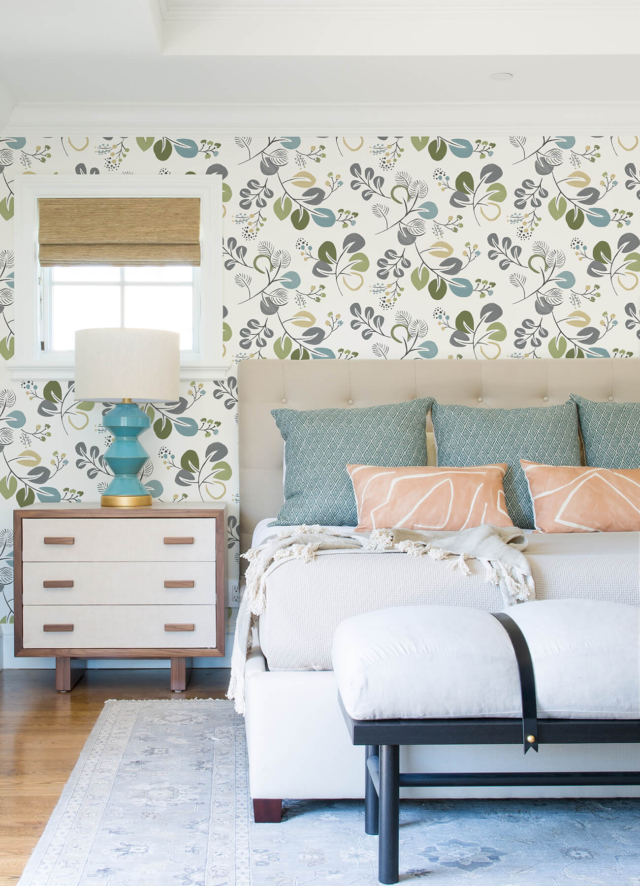 Add elegance and serenity to any space with this artistically designed botanical wallpaper. Clusters of green, pale yellow, light blue, and grey leaves trail across a cool white backdrop. Jonah is an unpasted, non woven wallpaper.