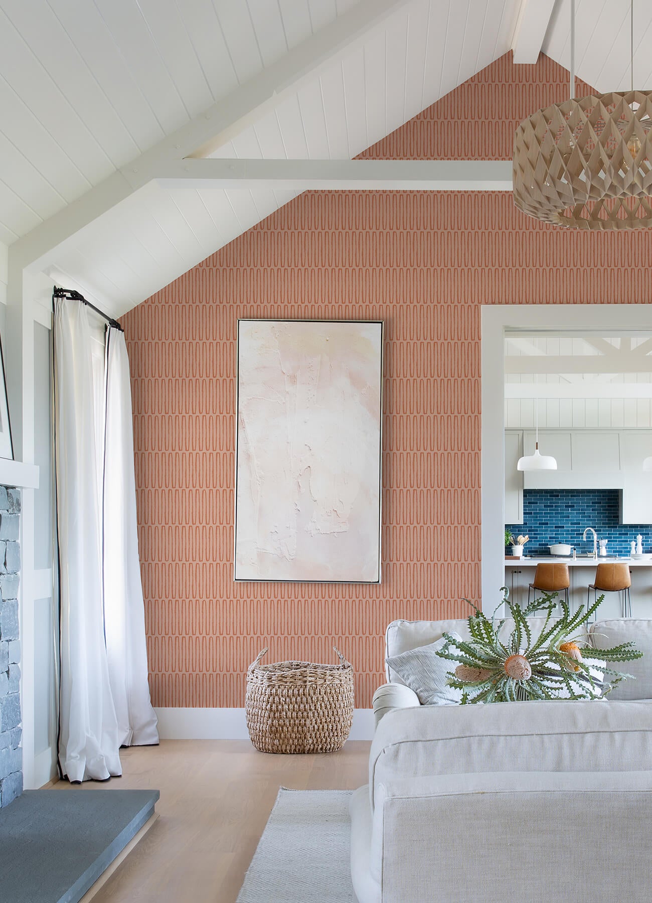 This wavy wallpaper is the perfect fusion of chic, simple, and retro! The waving, painted coral lines form tight peaks and valleys along a salmon-pink backdrop. Lars is an unpasted, non woven wallpaper.