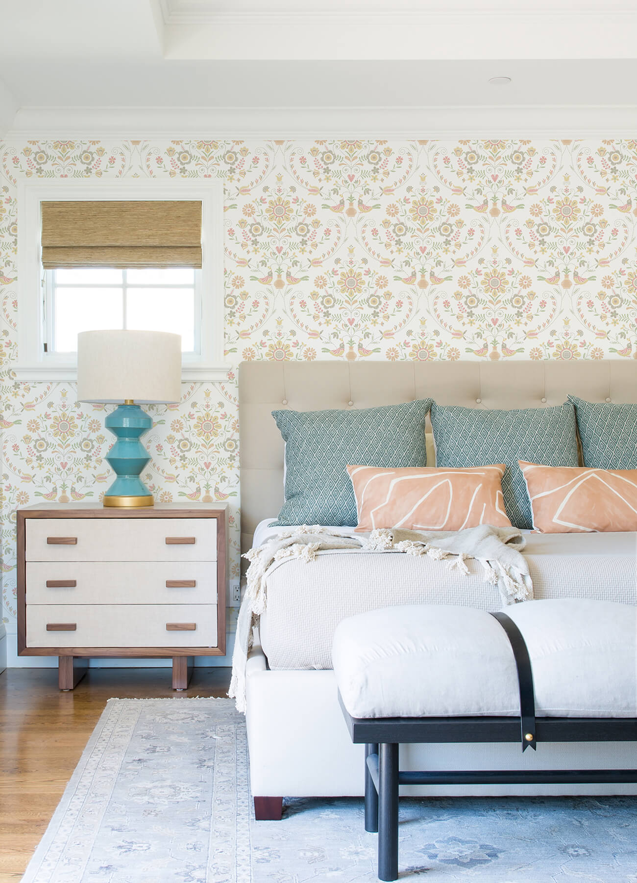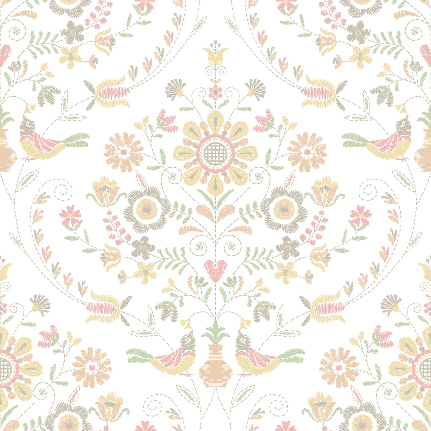 Embellish your walls with the sweet sophistication of this charming wallpaper! The damask design features an embroidered bouquet surrounded by songbirds, the details inked in peach, light yellow, sage green, pink, and grey. Britt is an unpasted, non woven wallpaper.