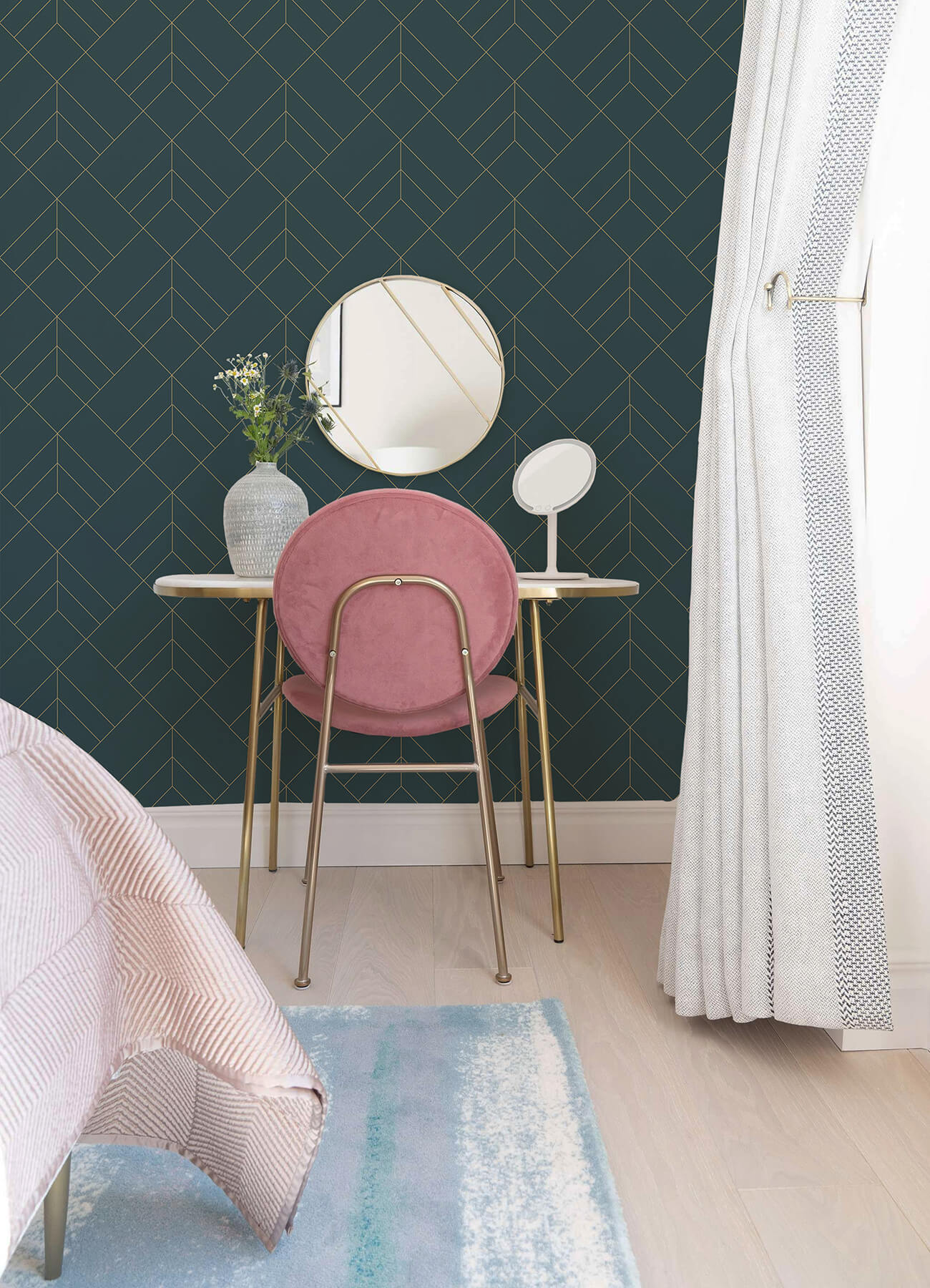 Streamlined with just the right amount of flair, this timeless geometric will add life to your interiors for years to come. The muted teal hue is embellished with a delicate. Golden grid of diamond geometrics. Sander is an unpasted, non woven wallpaper.