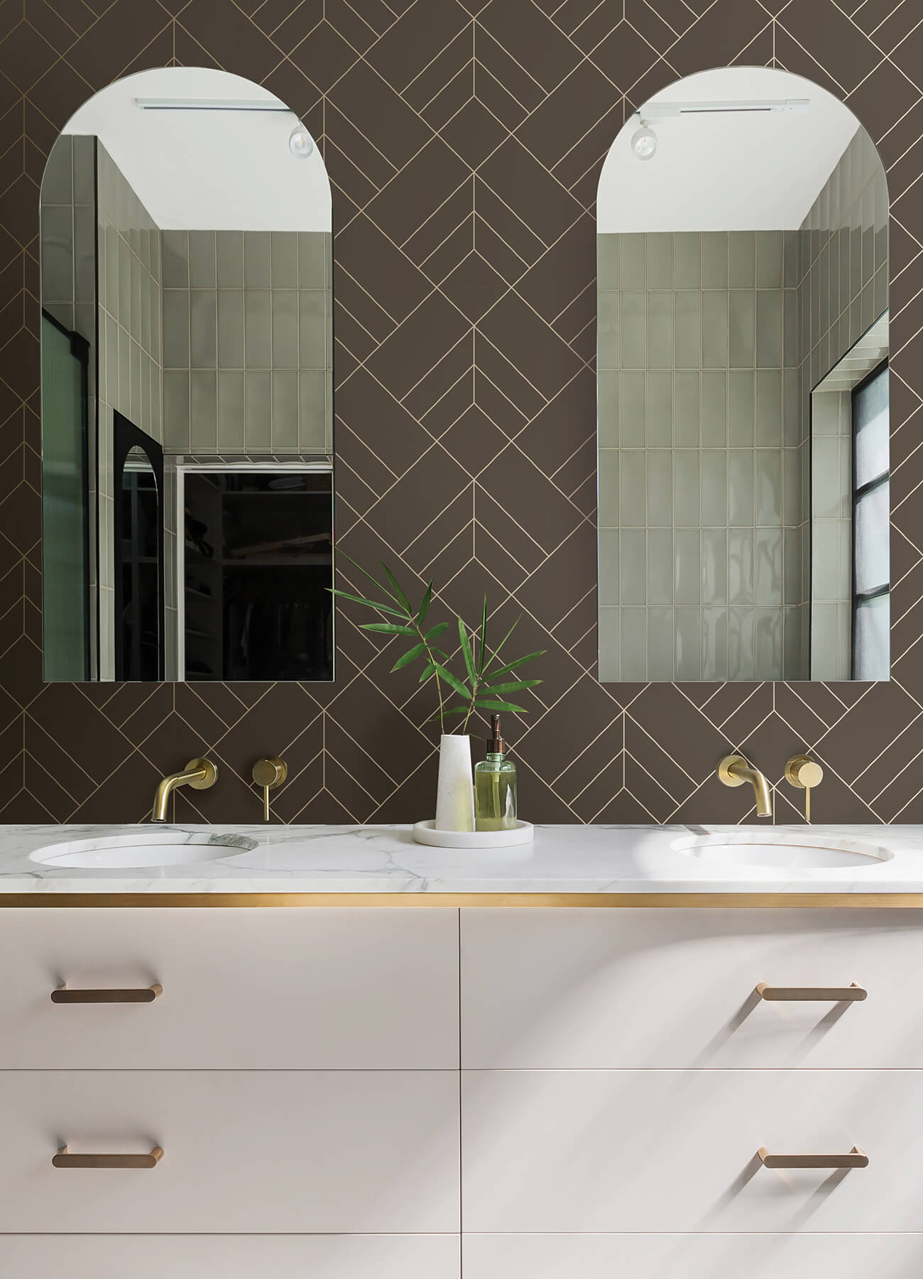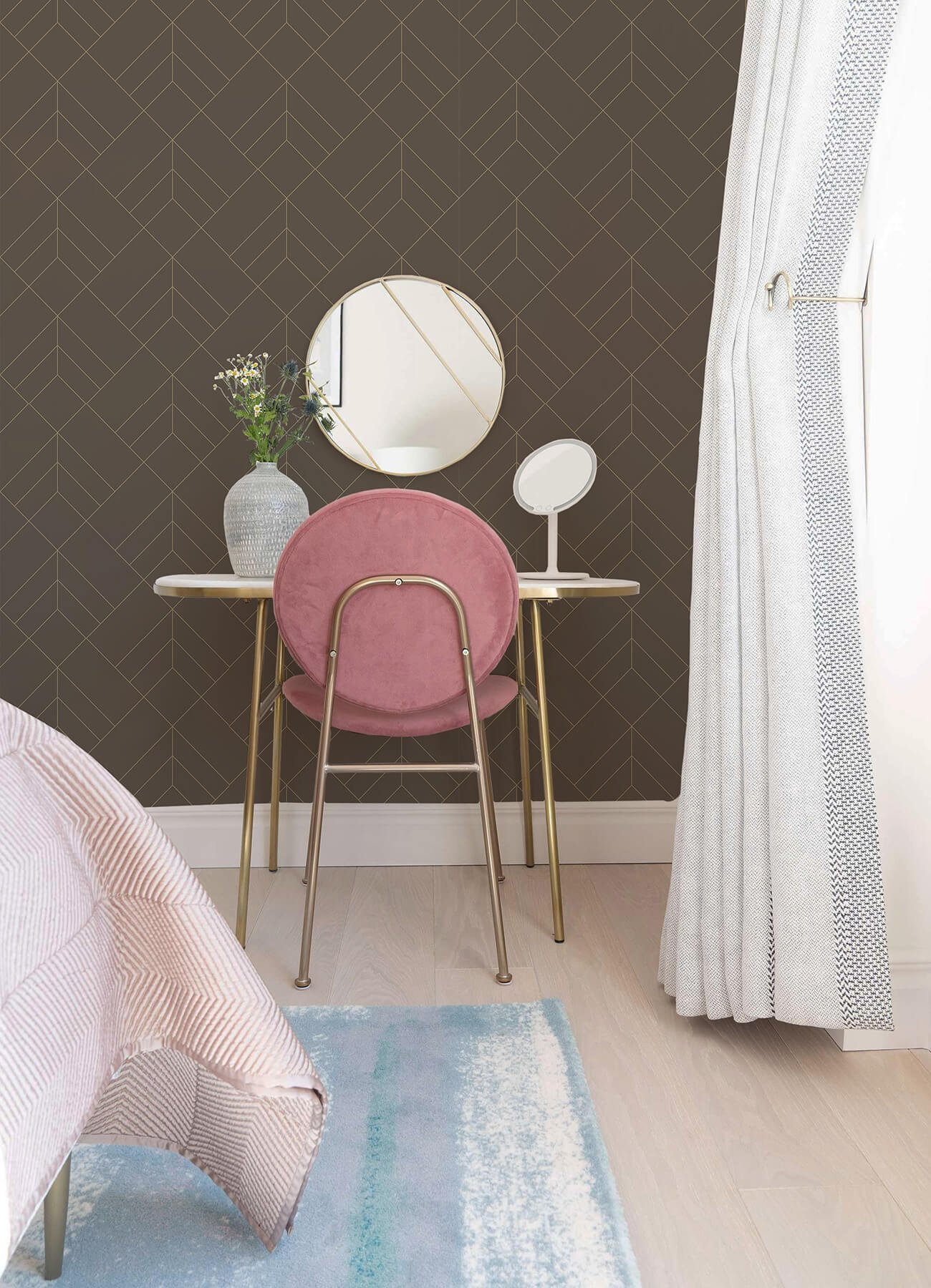 Enjoy a modern take on Art Deco elegance with this streamlined geometric wallpaper. The grid of diamond geometric is detailed in thin golden lines against a sumptuous, chocolatey-brown backdrop. Sander is an unpasted, non woven wallpaper.