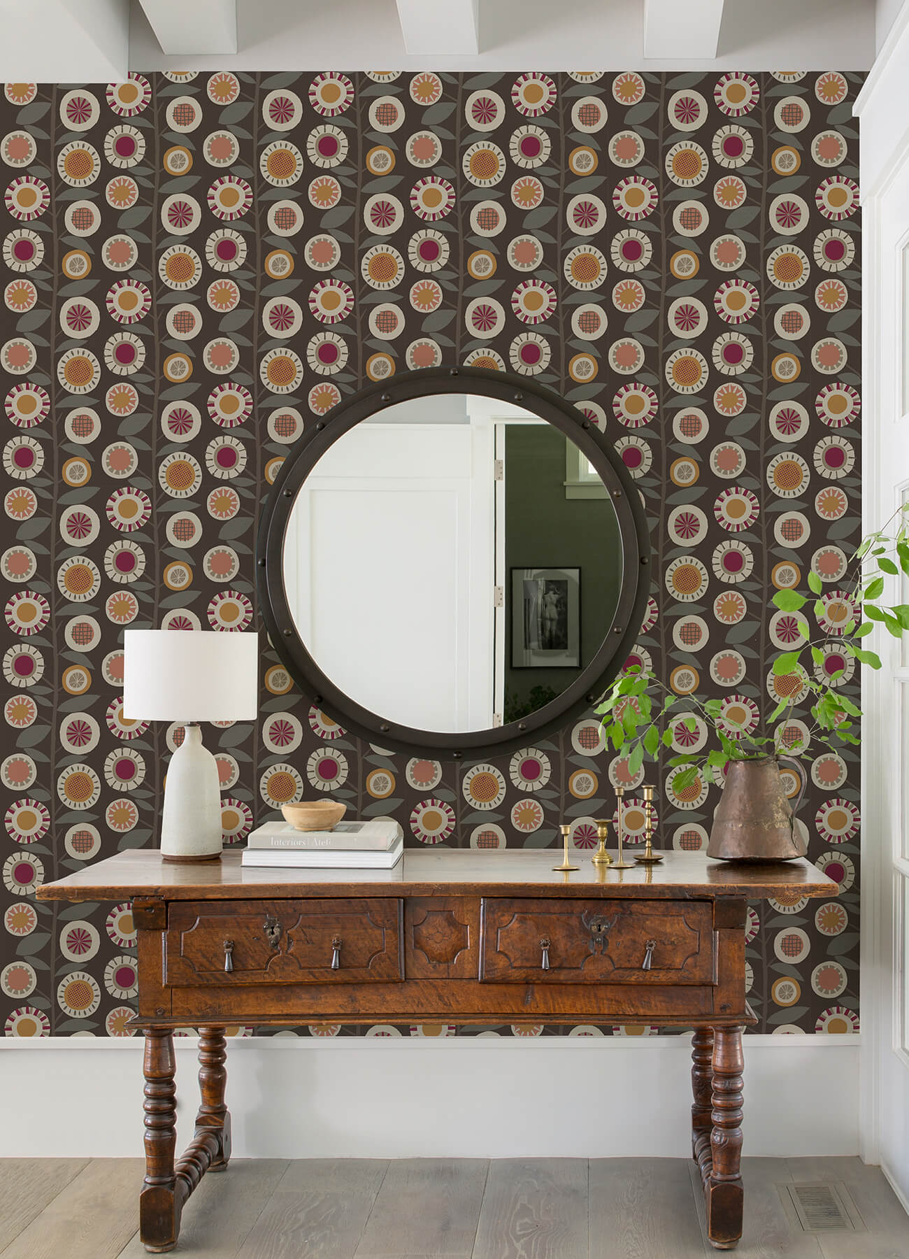 Modern, geometric florals are imbued with funky, vintage charm in this design! The towering columns of flowers are inked in a retro palette of taupe, orange, pink, raspberry against a chocolate-brown backdrop. Sisu is an unpasted, non woven wallpaper.