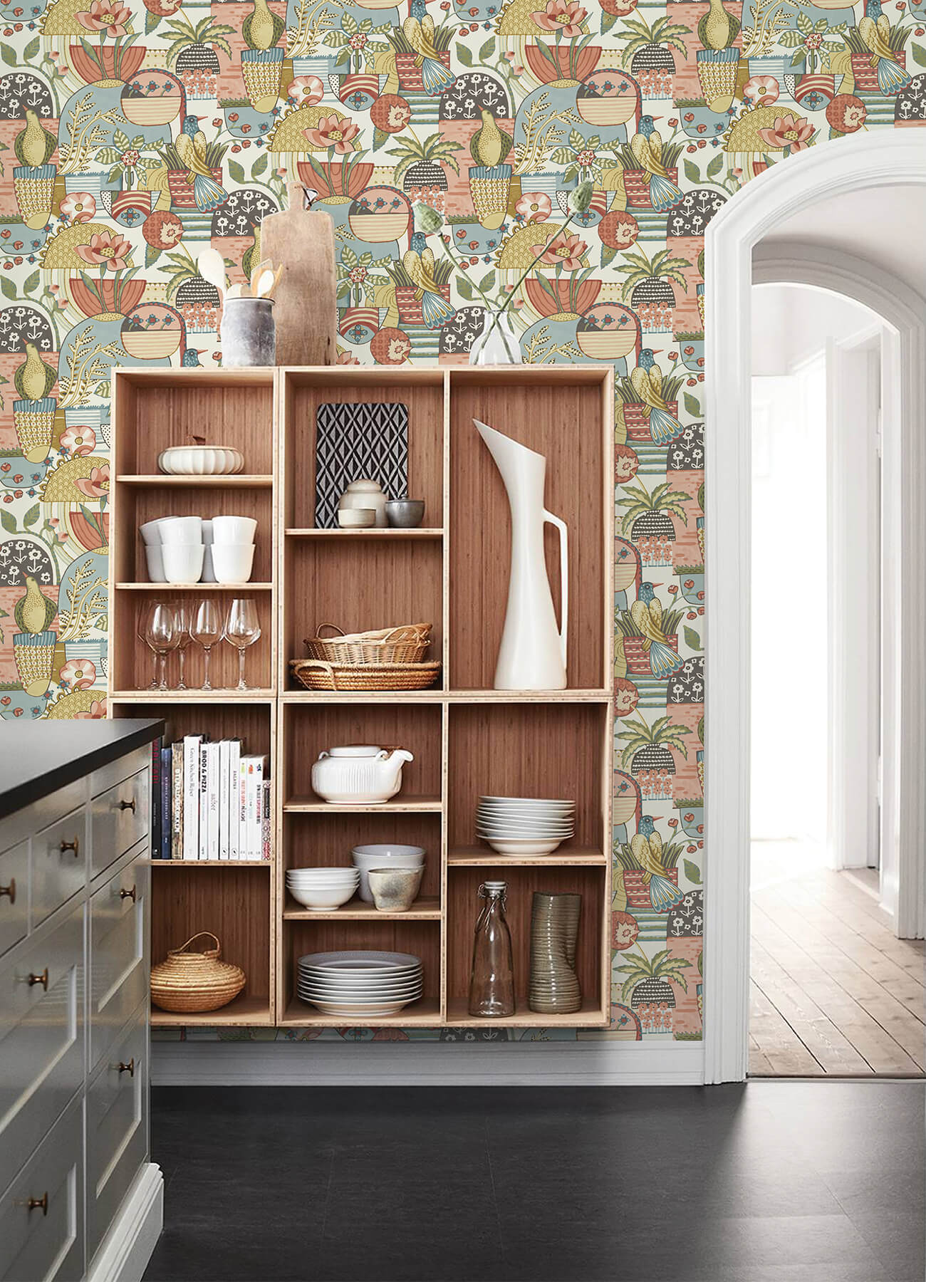 This eclectic wallpaper will bring warmth, energy, and charm to your walls! The illustrative design features layers upon layers of flowers, potted plants, and birds inked in a patinated palette of mustard, green, light blue, and pink. Fika is an unpasted, non woven wallpaper.
