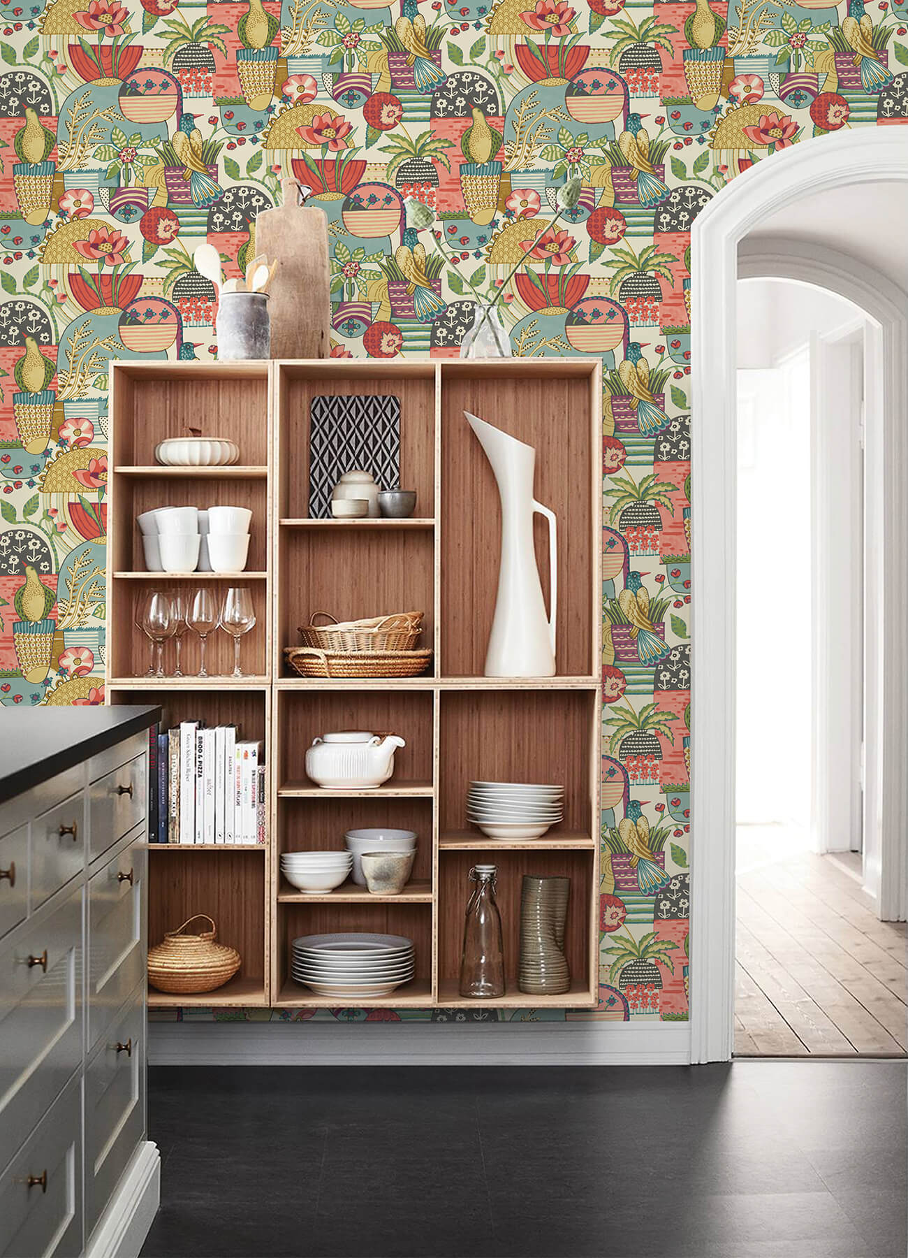 Wrap your walls in the warm and welcoming energy of this eclectic wallpaper. The illustrative design features layers upon layers of flowers, potted plants, and birds, the charming accents painted in a rainbow palette against a soft white backdrop. Fika is an unpasted, non woven wallpaper.
