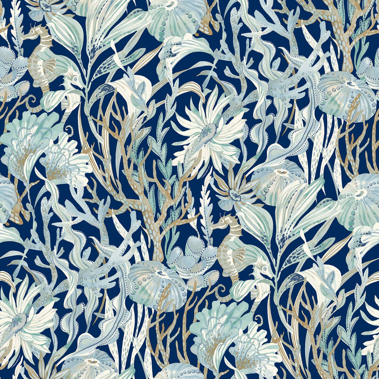 Explore the deep blue seas with this charming coral reef wallpaper. Seahorses and jellyfish sway among a bed of coral and seaweed, the details illustrated in blue, white, and golden brown along a navy-blue background Kelp Garden is a prepasted, sure strip wallpaper. Chesapeake wallpapers are classically beautiful. Each collection centers around a thematic influence, using familiar motifs and versatile prints to capture the essence of styles like coastal chic, French country, rustic charm, and traditional elegance. The high-quality patterns are designed to be enduring and timeless.