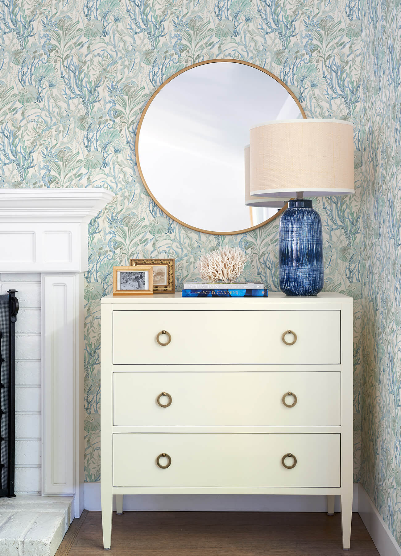 Enjoy a glimpse into an undersea world with this charming coral reef wallpaper. Jellyfish and seahorses navigate a rich, underwater landscape of seaweed and coral, the details illustrated in shades of blue and aqua. Kelp Garden is a prepasted, sure strip wallpaper. Chesapeake wallpapers are classically beautiful. Each collection centers around a thematic influence, using familiar motifs and versatile prints to capture the essence of styles like coastal chic, French country, rustic charm, and traditional elegance. The high-quality patterns are designed to be enduring and timeless.