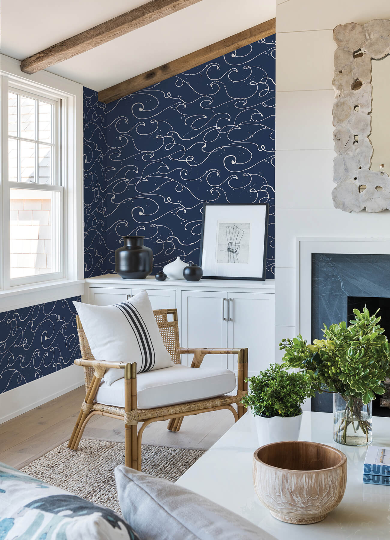 Bring the motion of the ocean to your home with this abstract wave design. The flowing, calligraphy-like strokes are dotted with stray splashes of white ink along its deep navy backdrop. Kuroshio is a prepasted, sure strip wallpaper. Chesapeake wallpapers are classically beautiful. Each collection centers around a thematic influence, using familiar motifs and versatile prints to capture the essence of styles like coastal chic, French country, rustic charm, and traditional elegance. The high-quality patterns are designed to be enduring and timeless.