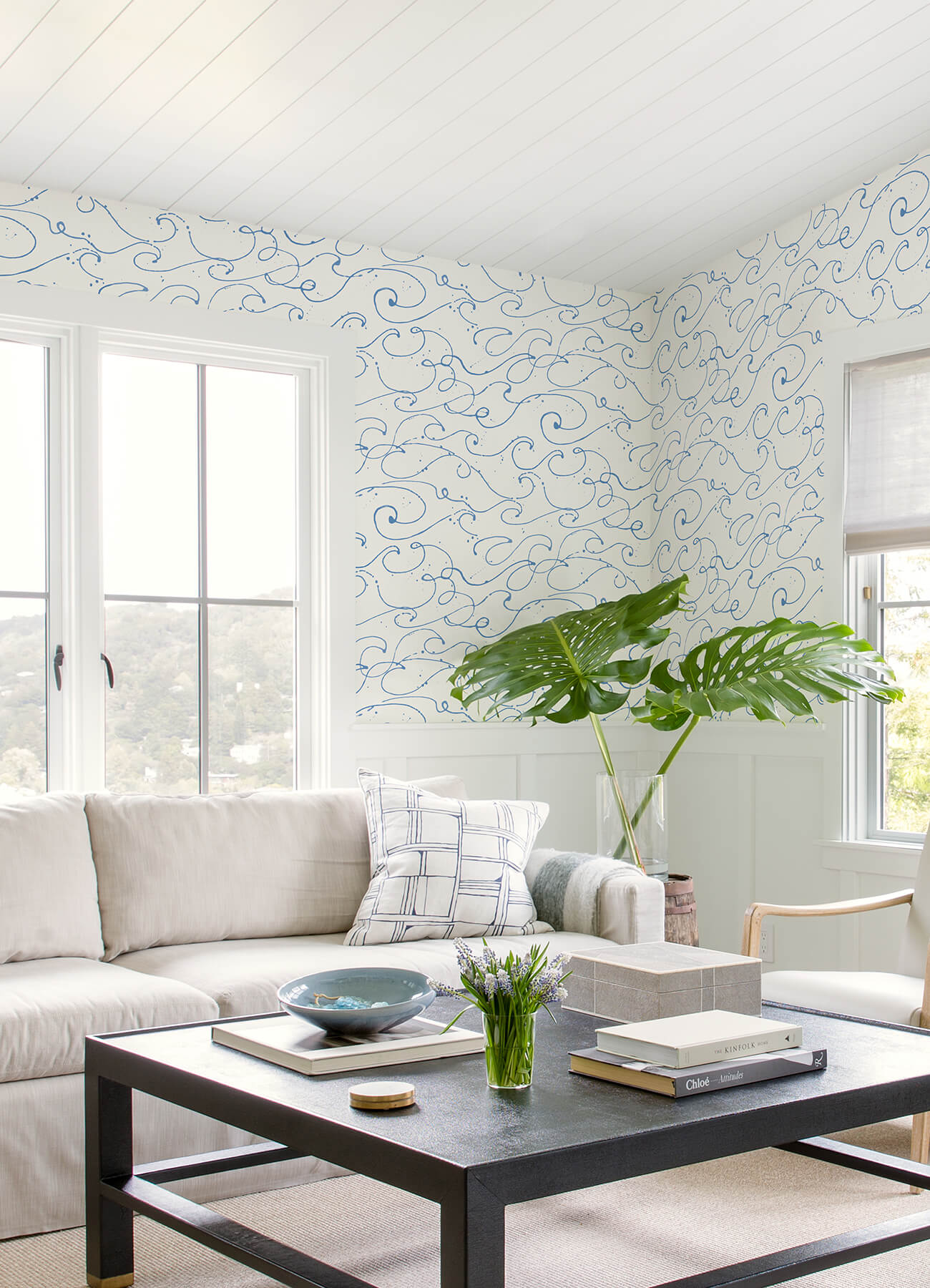 This abstract wave design brings the motion of the ocean to your walls. The free-form strokes of light blue have left a spattering of light blue dots along the white backdrop. Kuroshio is a prepasted, sure strip wallpaper. Chesapeake wallpapers are classically beautiful. Each collection centers around a thematic influence, using familiar motifs and versatile prints to capture the essence of styles like coastal chic, French country, rustic charm, and traditional elegance. The high-quality patterns are designed to be enduring and timeless.