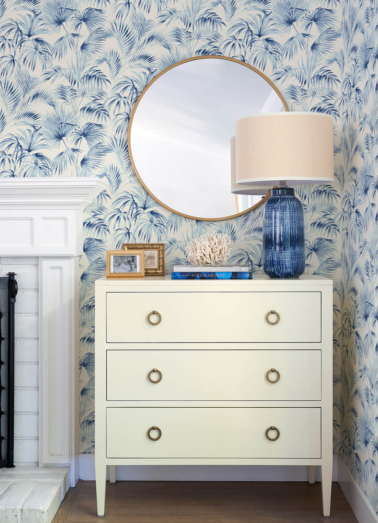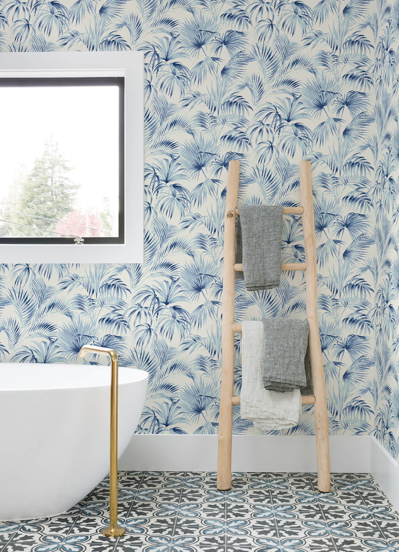 Create a space primed for relaxation with this chic tropical wallpaper. The palm fronds are painted in shades of blue against a white background. Manaus is a prepasted, sure strip wallpaper. Chesapeake wallpapers are classically beautiful. Each collection centers around a thematic influence, using familiar motifs and versatile prints to capture the essence of styles like coastal chic, French country, rustic charm, and traditional elegance. The high-quality patterns are designed to be enduring and timeless.