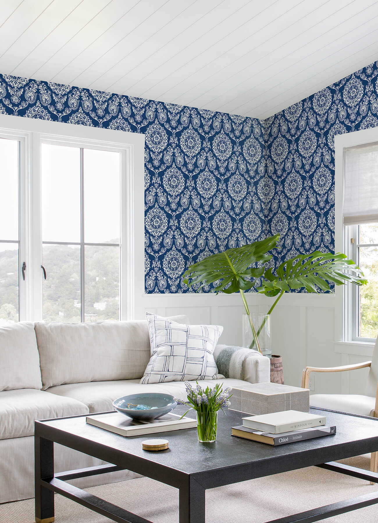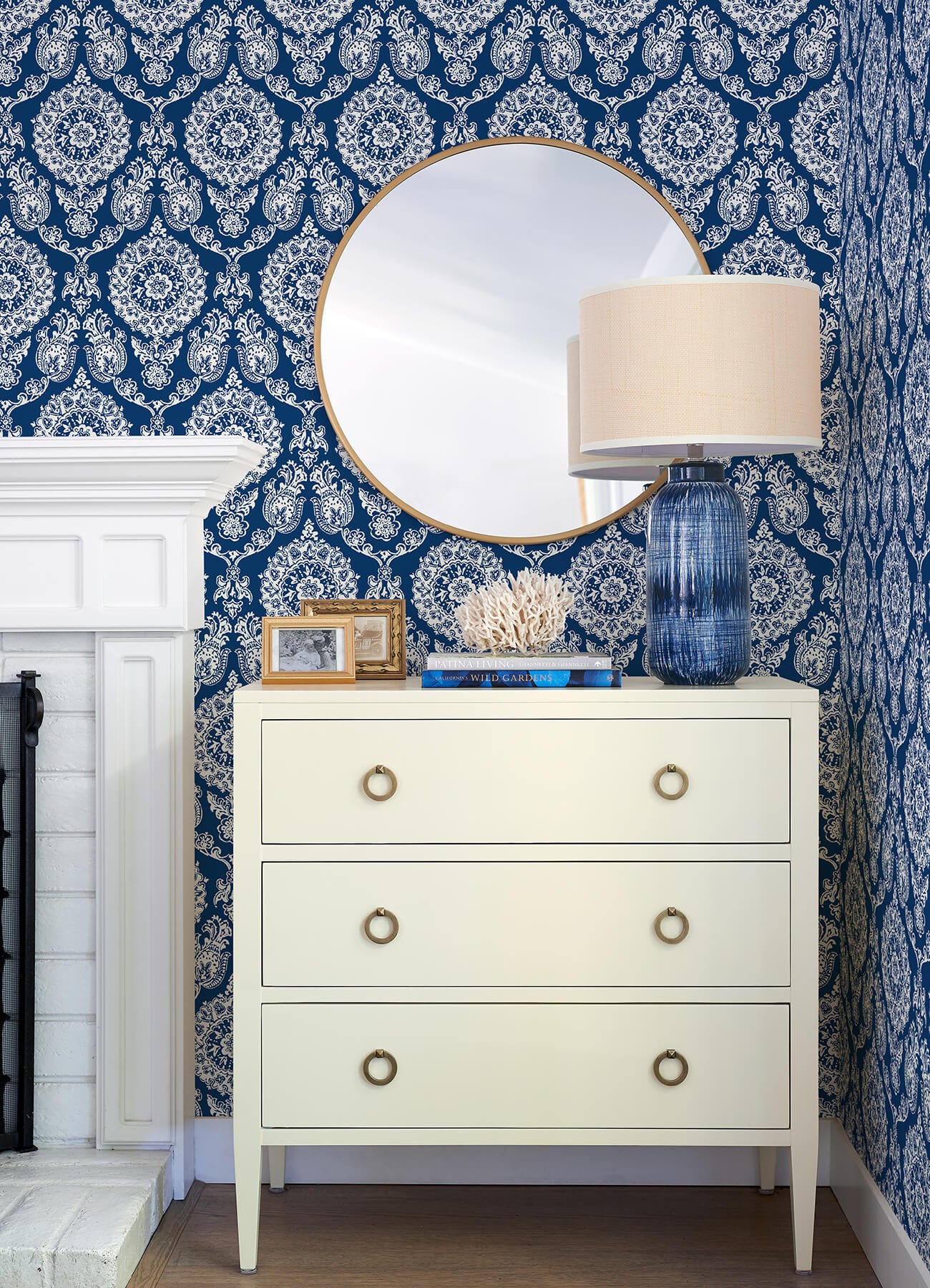 Chesapeake Blue Heron Helm Damask Floral Medallion Wallpaper - Navy