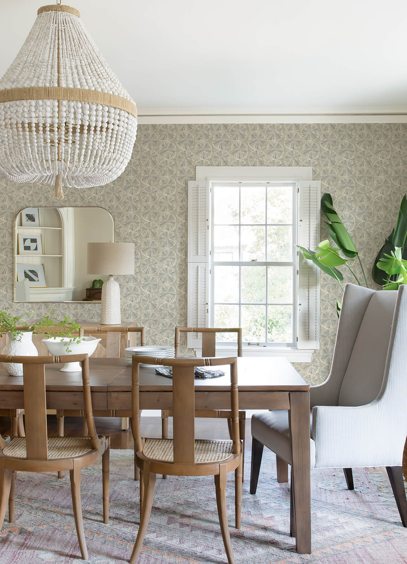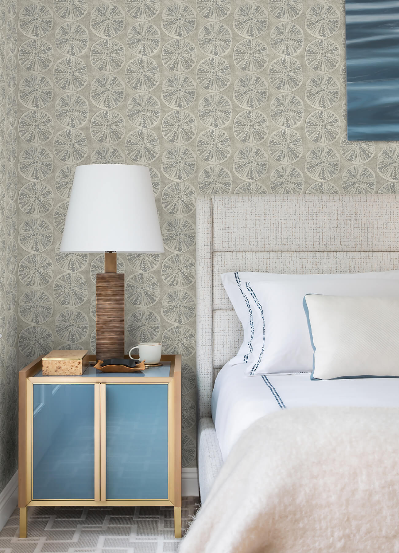 Chic and contemporary, this gorgeous coastal wallpaper brings sand dollars to the forefront! The rounded medallions feature a subtle star, all the details inked in various shades of grey. Sea Biscuit is a prepasted, sure strip wallpaper. Chesapeake wallpapers are classically beautiful. Each collection centers around a thematic influence, using familiar motifs and versatile prints to capture the essence of styles like coastal chic, French country, rustic charm, and traditional elegance. The high-quality patterns are designed to be enduring and timeless.