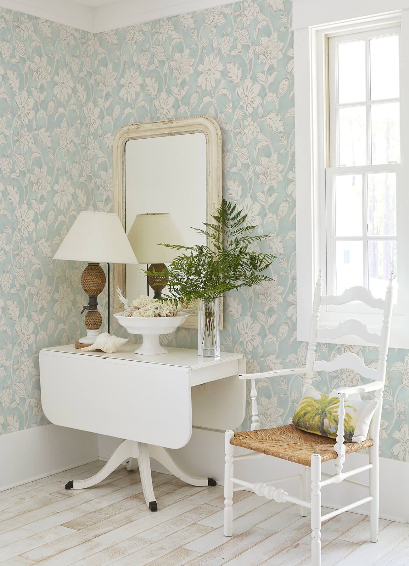 Bring soft, feminine charm to your interiors with this floral trail design. The illustrative blooms are printed in white and then loosely outlined in grey against an aqua watercolor backdrop. Plumeria is a prepasted, sure strip wallpaper. Chesapeake wallpapers are classically beautiful. Each collection centers around a thematic influence, using familiar motifs and versatile prints to capture the essence of styles like coastal chic, French country, rustic charm, and traditional elegance. The high-quality patterns are designed to be enduring and timeless.