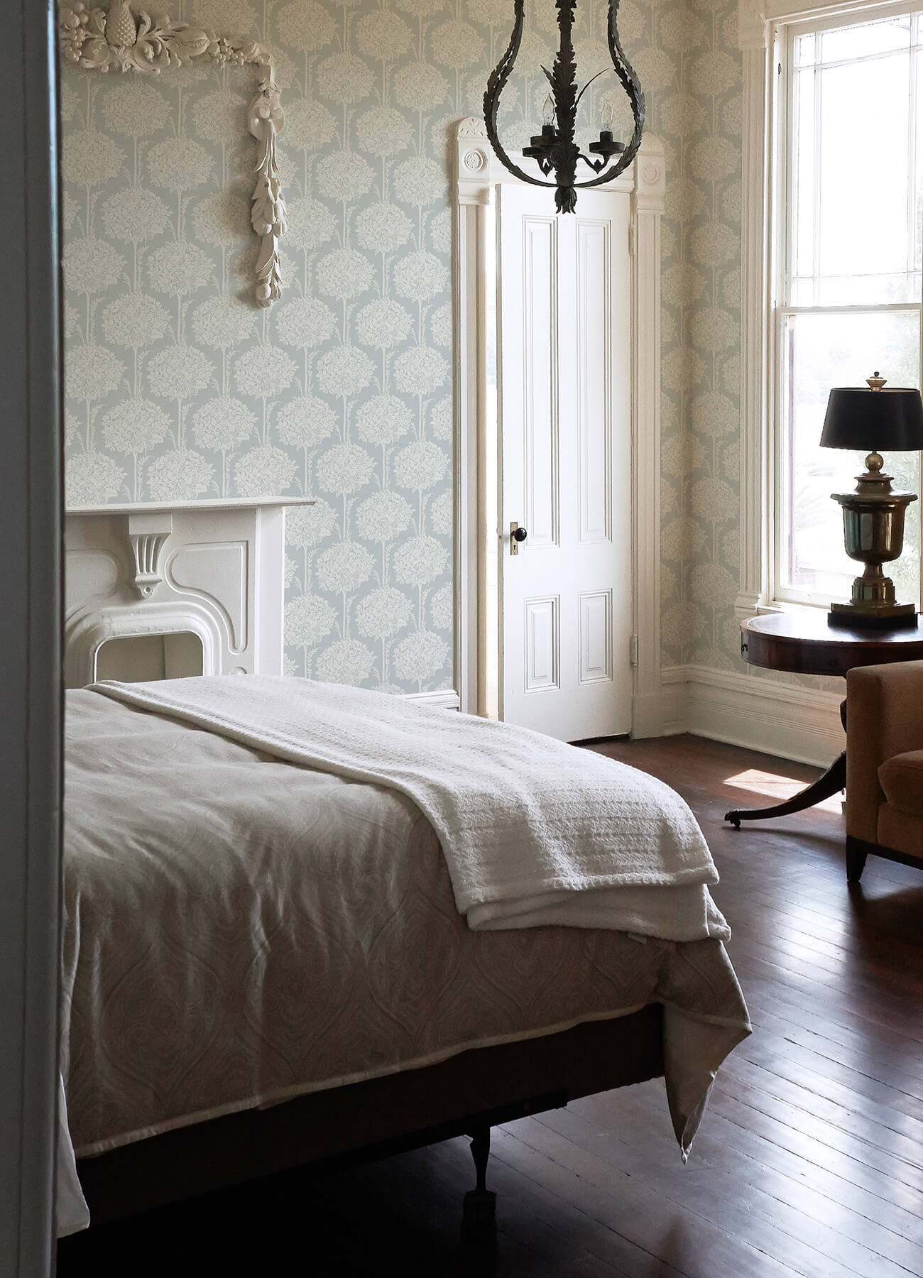 Serene and sophisticated, this tree wallpaper is as timeless as it is elegant. The manicured topiaries host both birds and flowers, the details stamped in white along a powder blue background. Zaria is an unpasted, non woven wallpaper. Elevate your home with the subtle colors and warm sophistication of Georgia wallpaper collection by A-Street Prints. Timeless design is revisited and rejuvenated with this assortment of elegant botanical, striking geometric, and complementary textures.