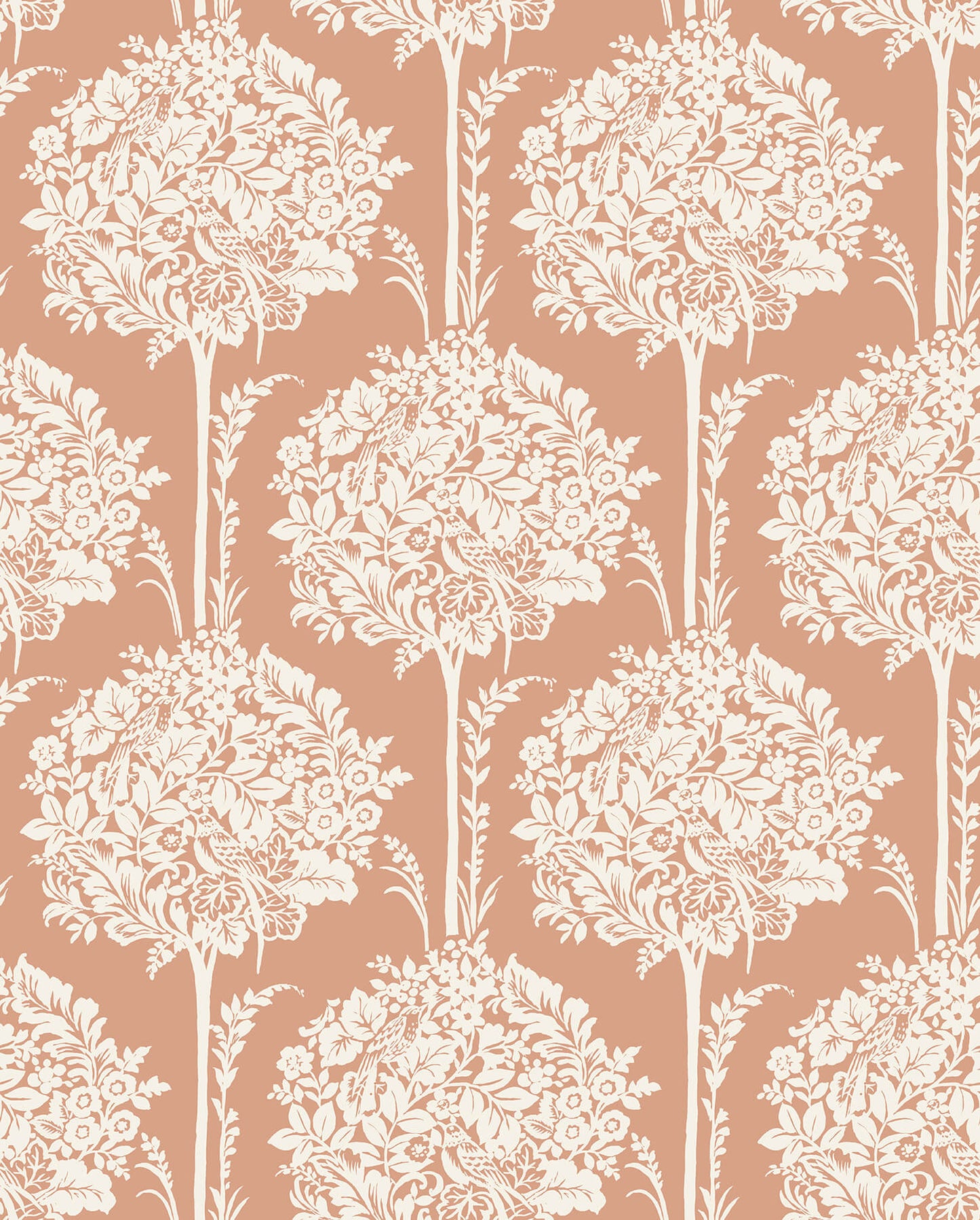 The warm hues and timeless elegance of this gorgeous tree wallpaper are a perfect pairing. The manicured topiaries are decorated with flowers and birds, the design stamped in white along an apricot background. Zaria is an unpasted, non woven wallpaper. Elevate your home with the subtle colors and warm sophistication of Georgia wallpaper collection by A-Street Prints. Timeless design is revisited and rejuvenated with this assortment of elegant botanical, striking geometric, and complementary textures.