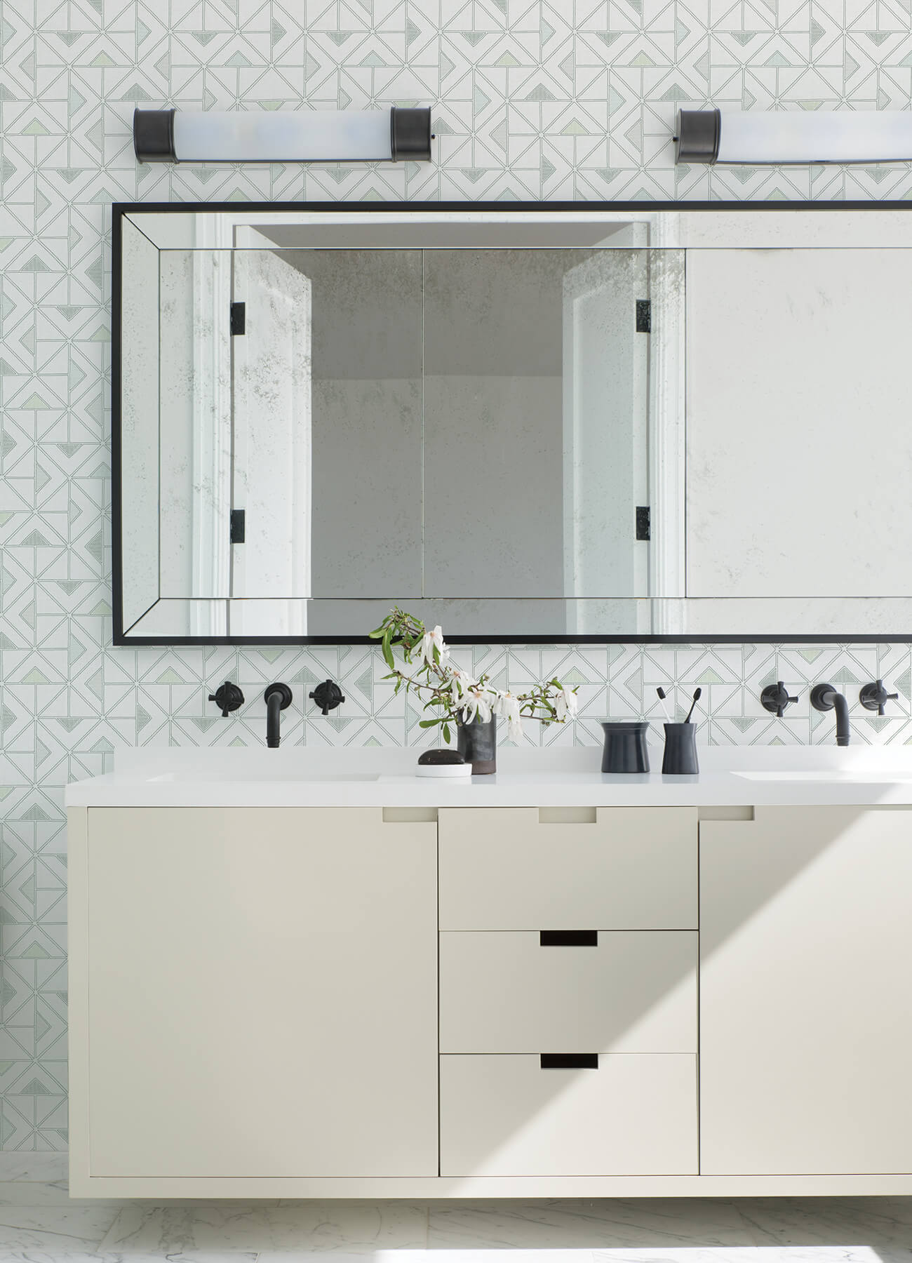This artistic geometric wallpaper adds fresh inspiration to retro stylings! Hand-drawn triangular tiles are sporadically embellished with green, grey, and light blue insets, all set against a creamy-white faux linen backdrop. Jekyl is an unpasted, non woven wallpaper. Elevate your home with the subtle colors and warm sophistication of Georgia wallpaper collection by A-Street Prints. Timeless design is revisited and rejuvenated with this assortment of elegant botanical, striking geometric, and complementary textures.