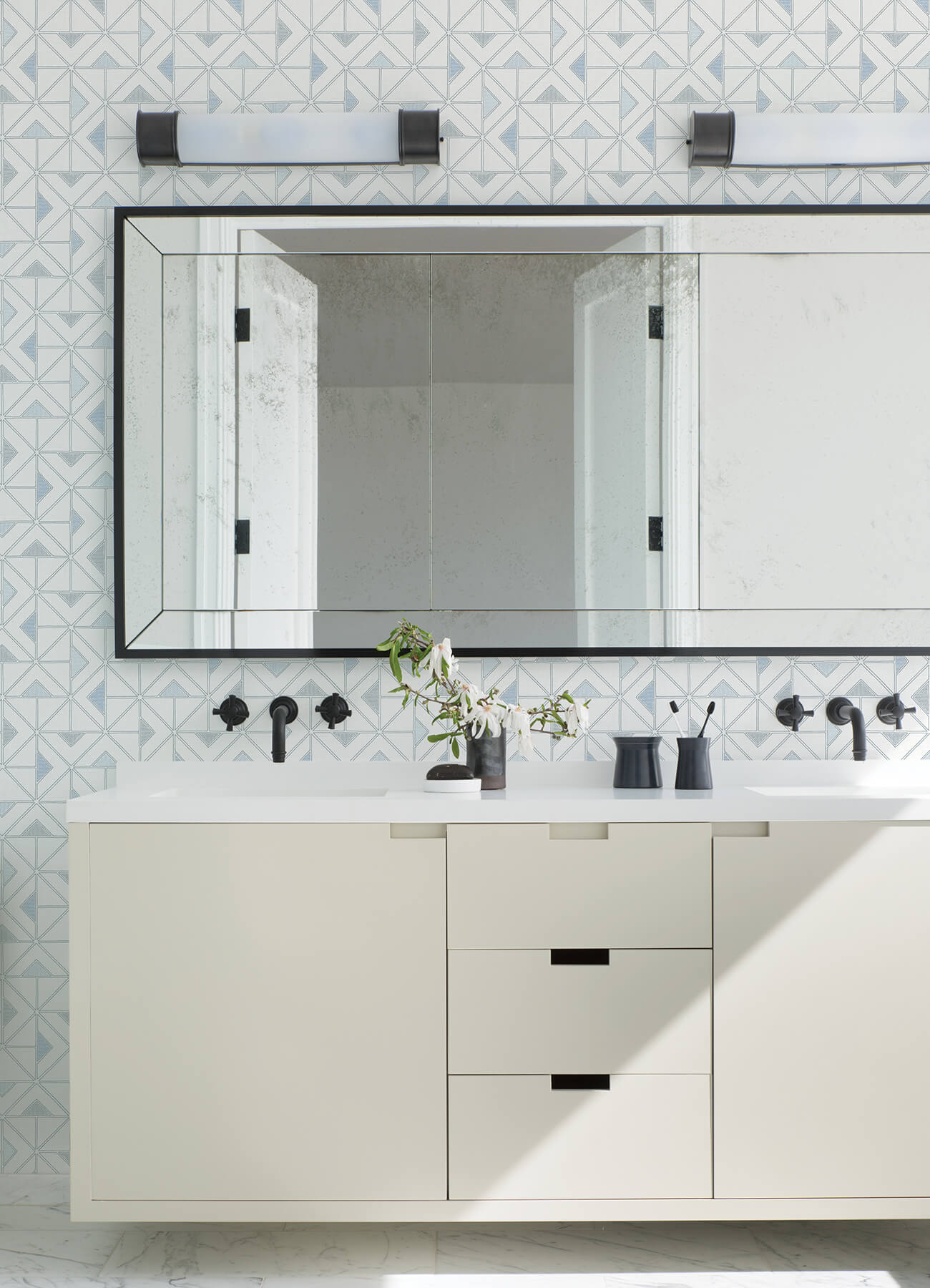 A delightful blend of retro and fresh, modern flair, this geometric wallpaper brings character and charm to your interiors. The hand-drawn triangular motif is accented with blue insets along a cool white faux linen backdrop. Jekyl is an unpasted, non woven wallpaper. Elevate your home with the subtle colors and warm sophistication of Georgia wallpaper collection by A-Street Prints. Timeless design is revisited and rejuvenated with this assortment of elegant botanical, striking geometric, and complementary textures.