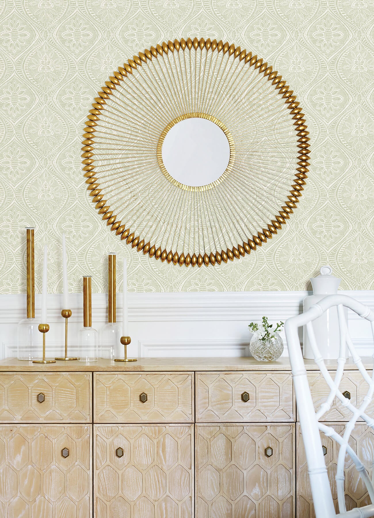 Playful yet sophisticated, this floral ogee design is a timeless finishing touch for your interiors. The curving columns and botanical medallions are all intricately formed from dashes of mossy green raised inks. Scout is an unpasted, non woven wallpaper. Elevate your home with the subtle colors and warm sophistication of Georgia wallpaper collection by A-Street Prints. Timeless design is revisited and rejuvenated with this assortment of elegant botanical, striking geometric, and complementary textures.
