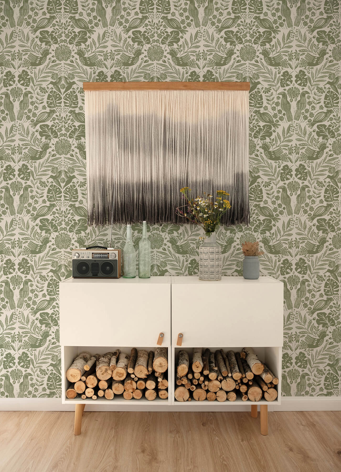 Birds of a feather flock together in this whimsical damask wallpaper. Hummingbirds, toucans, parrots, and cockatoos all roost within lush tropical flora, the details blocked pinked in olive green against cream. Nestle is an unpasted, non woven wallpaper measuring 20.5 inches wide by 33 feet long, covering approximately 56.4 square feet per roll. Terrace by A-Street Prints wallpaper collection is a delightful cultivation of chic, nature inspired designs. This vibrant collection features a bohemian blend of bountiful botanicals, complementary geometrics, and reinvigorated classic patterns.