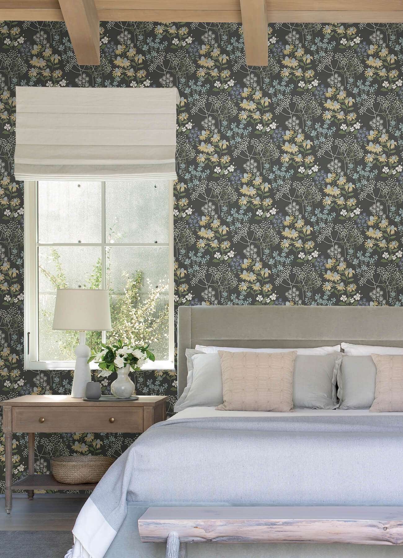 This painterly floral wallpaper adds soft, feminine charm to your interiors. The first riotous blooms of spring are painted in watercolor blues, green, pale yellow, and white against a rich charcoal-grey backdrop. Cultivate is an unpasted, non woven wallpaper measuring 20.5 inches wide by 33 feet long, covering approximately 56.4 square feet per roll. Terrace by A-Street Prints wallpaper collection is a delightful cultivation of chic, nature inspired designs. This vibrant collection features a bohemian blend of bountiful botanicals, complementary geometrics, and reinvigorated classic patterns.