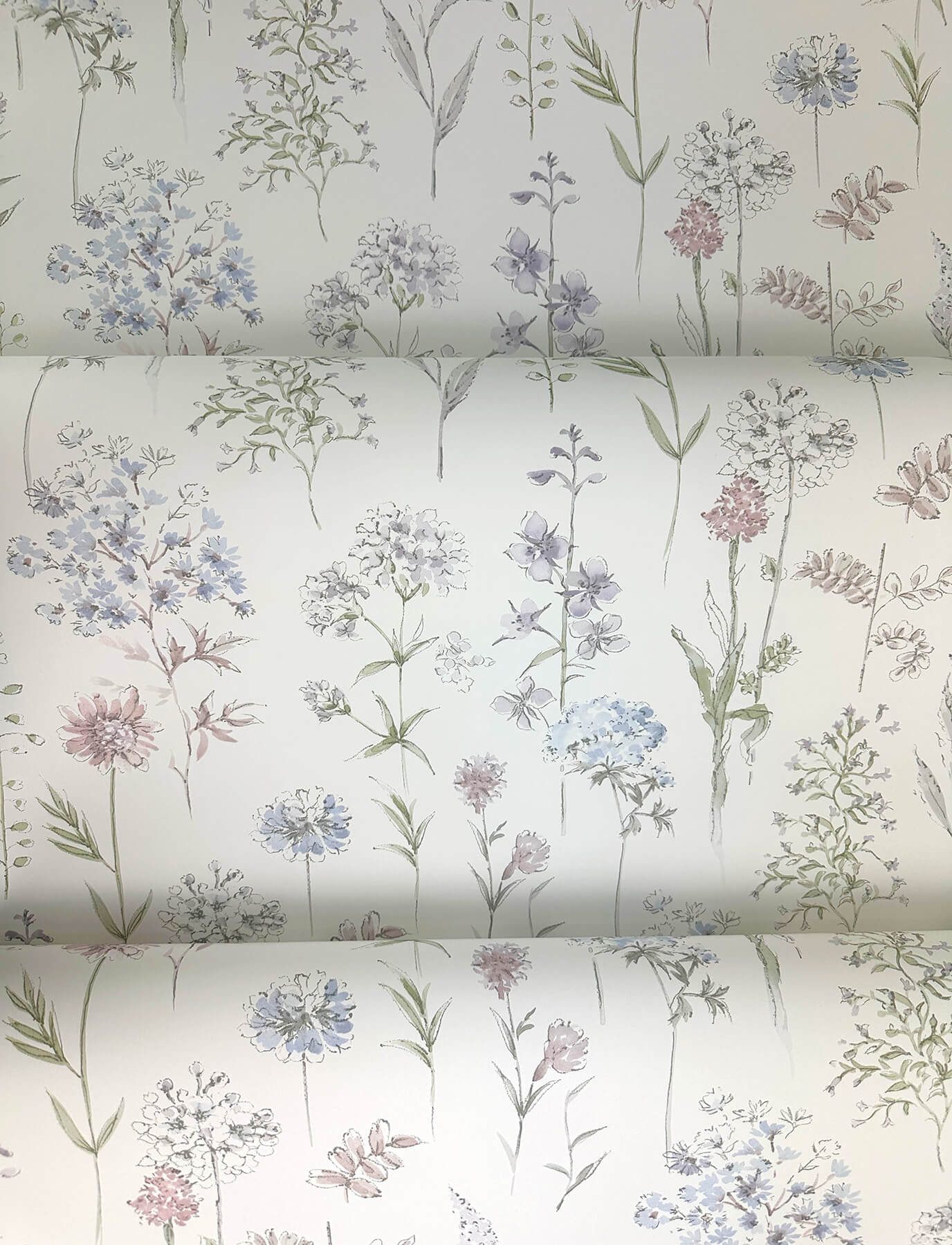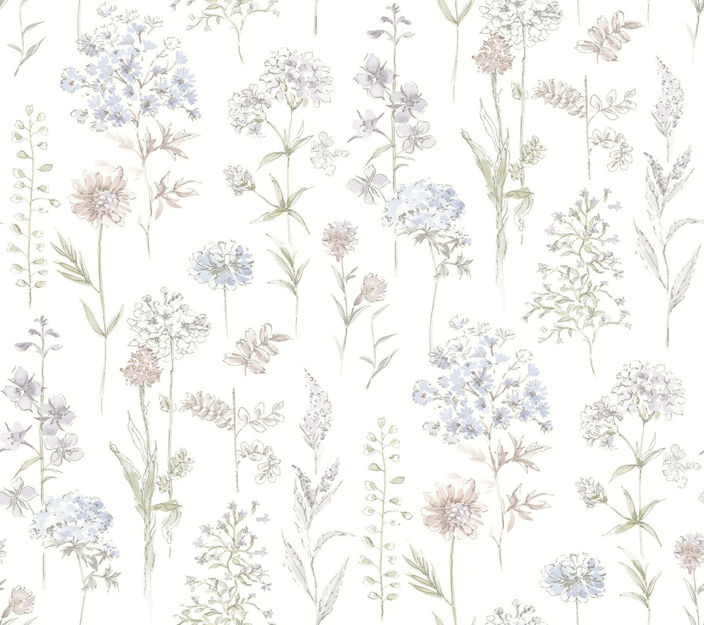 The untamed beauty of wildflowers is lovingly captured with a series of watercolor botanical illustrations, inked in shades of lavender, pale pink, and periwinkle blue . Bergamot is a prepasted, sure strip wallpaper measuring 27 inches wide by 27 feet long, covering approximately 60.8 square feet per roll. Inspired by the charming ambiance of herb filled gardens, Chesapeake Wildflower wallpaper collection features elegant botanical patterns, old world architectural motifs, and other vintage touches.