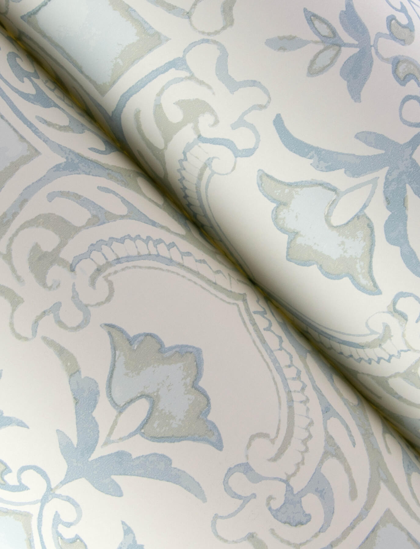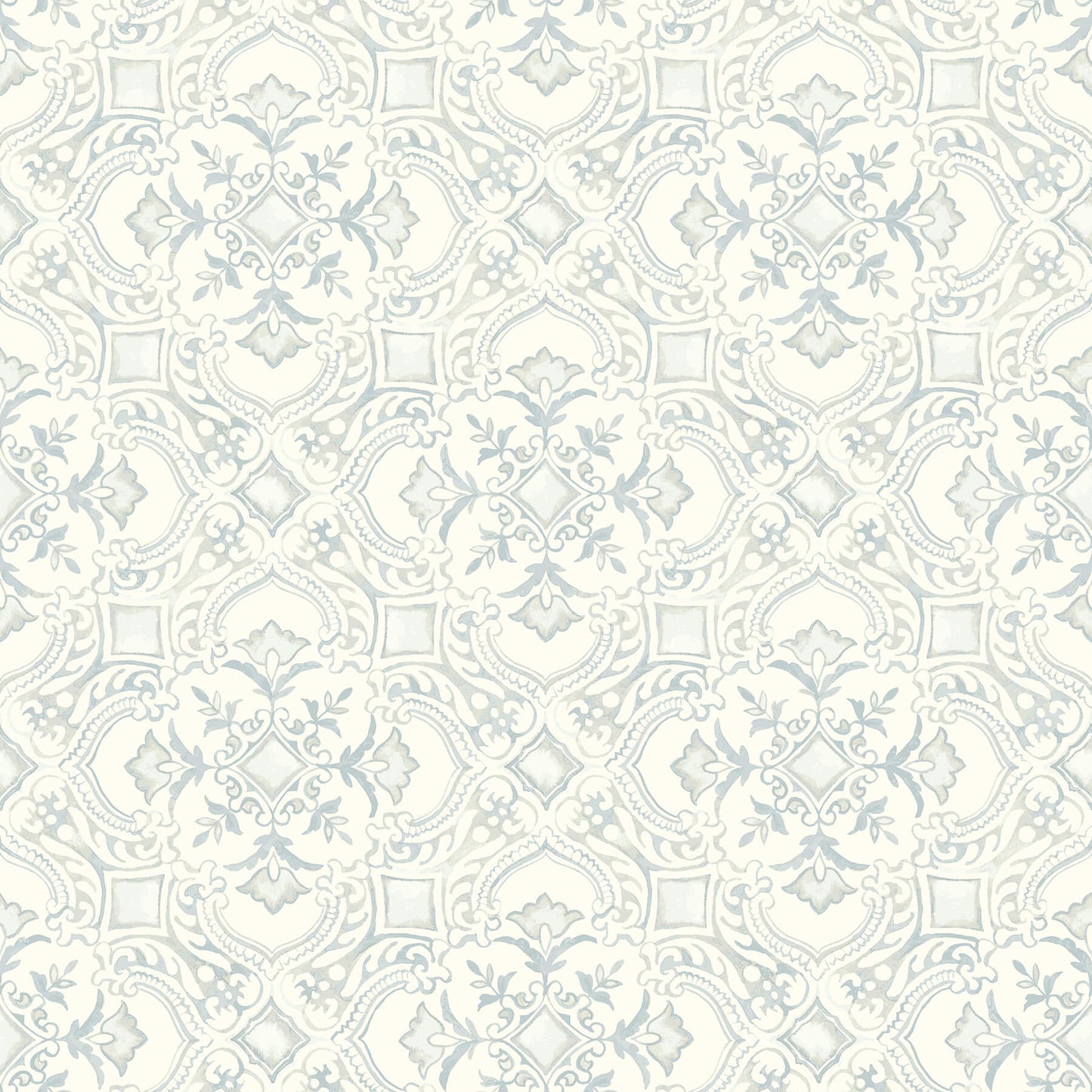 Elegant white quatrefoil tiles are embellished with delicate blue and pale grey floral etchings, the space between each tile filled with scrollwork and geometric spacers. Marjoram is a prepasted, sure strip wallpaper measuring 20.5 inches wide by 33 feet long, covering approximately 56.4 square feet per roll. Inspired by the charming ambiance of herb filled gardens, Chesapeake Wildflower wallpaper collection features elegant botanical patterns, old world architectural motifs, and other vintage touches.