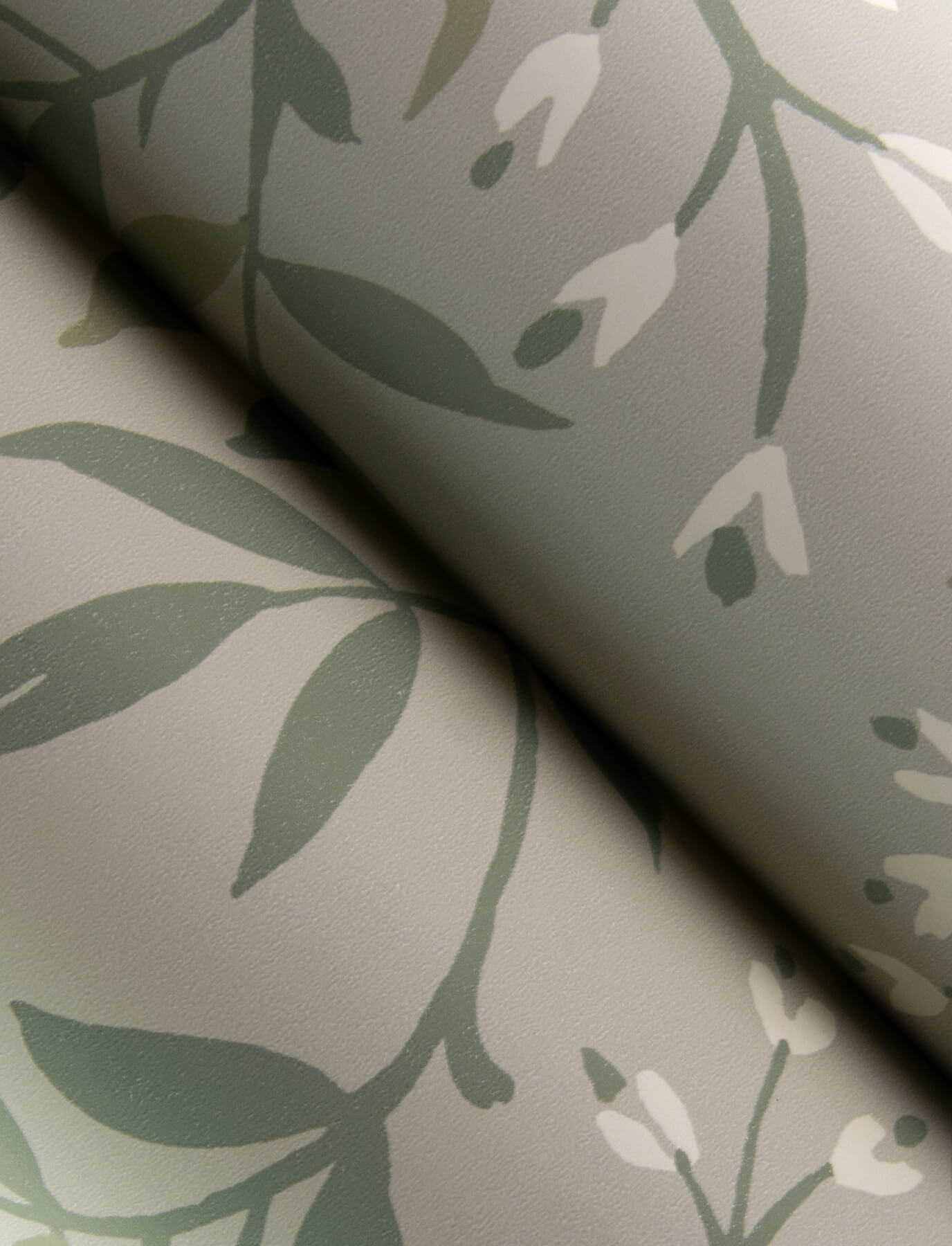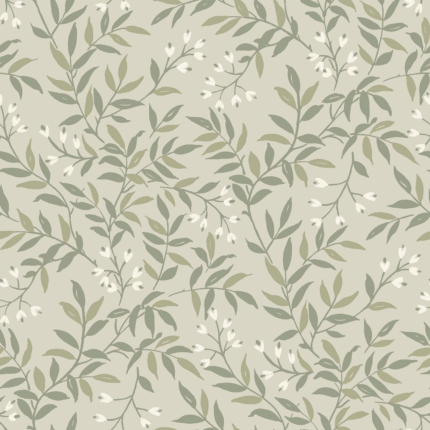 This romantic botanical design features swaying, leafy green vines dotted with budding white flowers, all offset against a pale grey backdrop. Senna is a prepasted, sure strip wallpaper measuring 20.5 inches wide by 33 feet long, covering approximately 56.4 square feet per roll. Inspired by the charming ambiance of herb filled gardens, Chesapeake Wildflower wallpaper collection features elegant botanical patterns, old world architectural motifs, and other vintage touches.