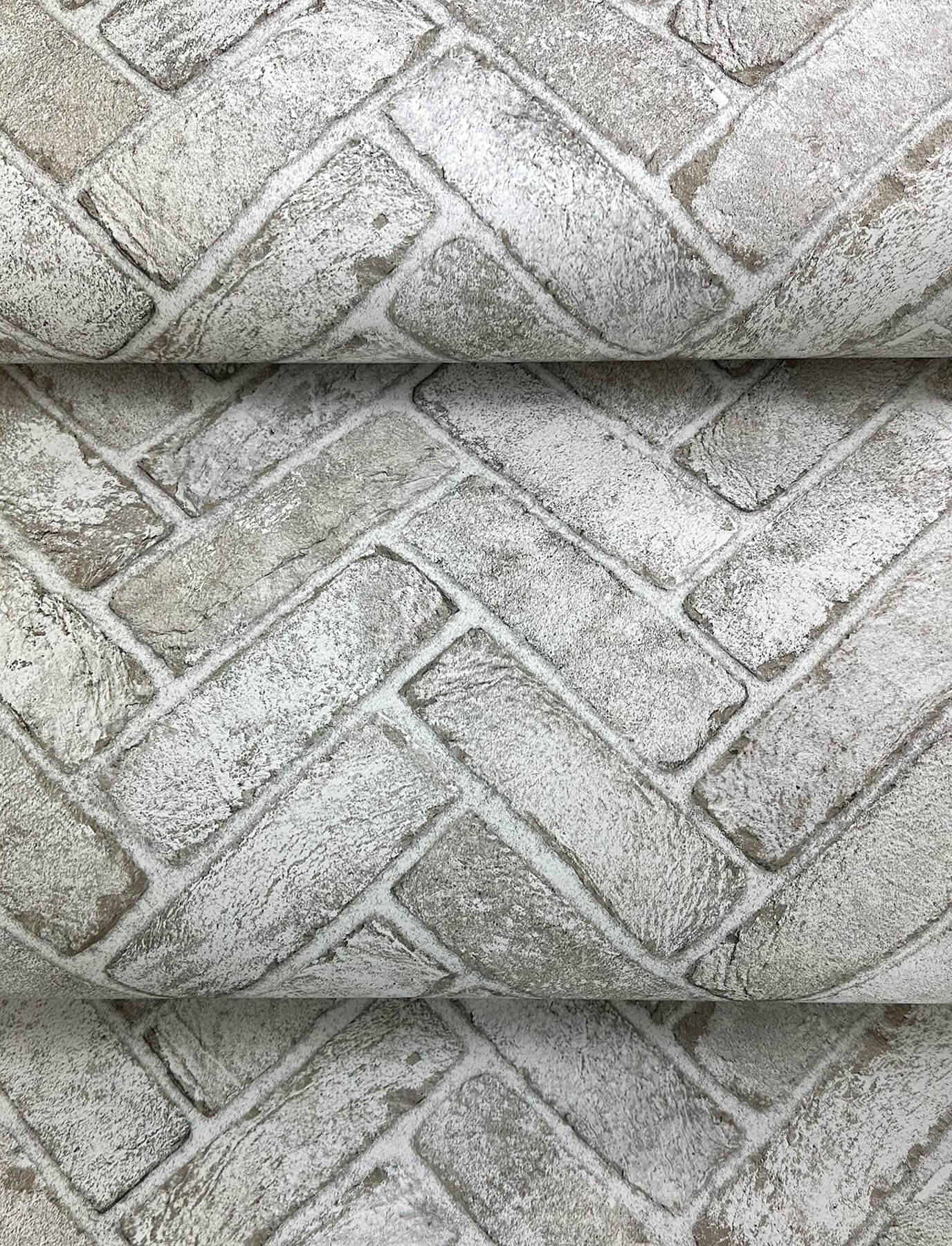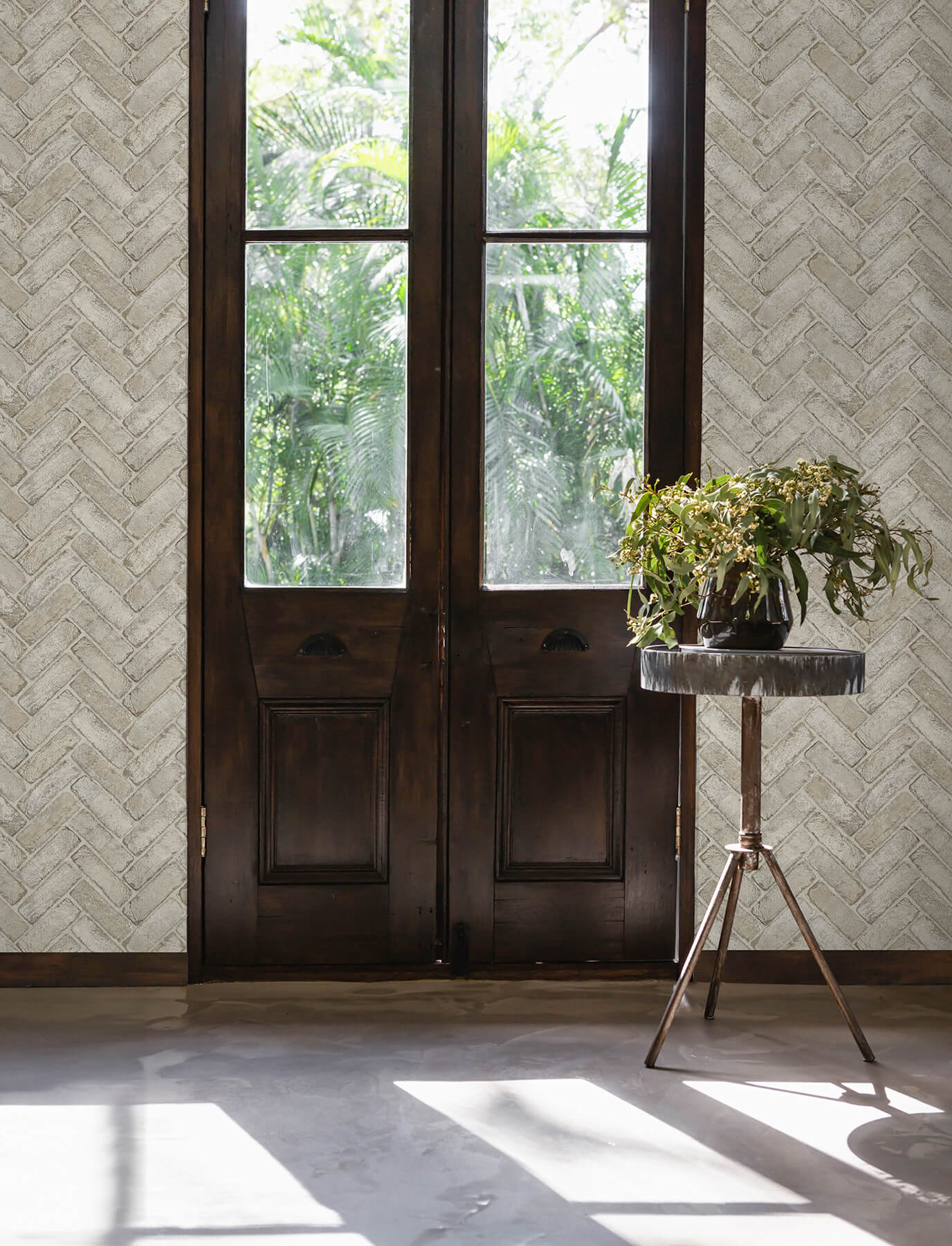 Create a rustic backdrop with modern flair with this wallpaper that emulates neutral-hued bricks laid in a herringbone pattern. Canelle is a prepasted, sure strip wallpaper measuring 20.5 inches wide by 33 feet long, covering approximately 56.4 square feet per roll. Inspired by the charming ambiance of herb filled gardens, Chesapeake Wildflower wallpaper collection features elegant botanical patterns, old world architectural motifs, and other vintage touches.