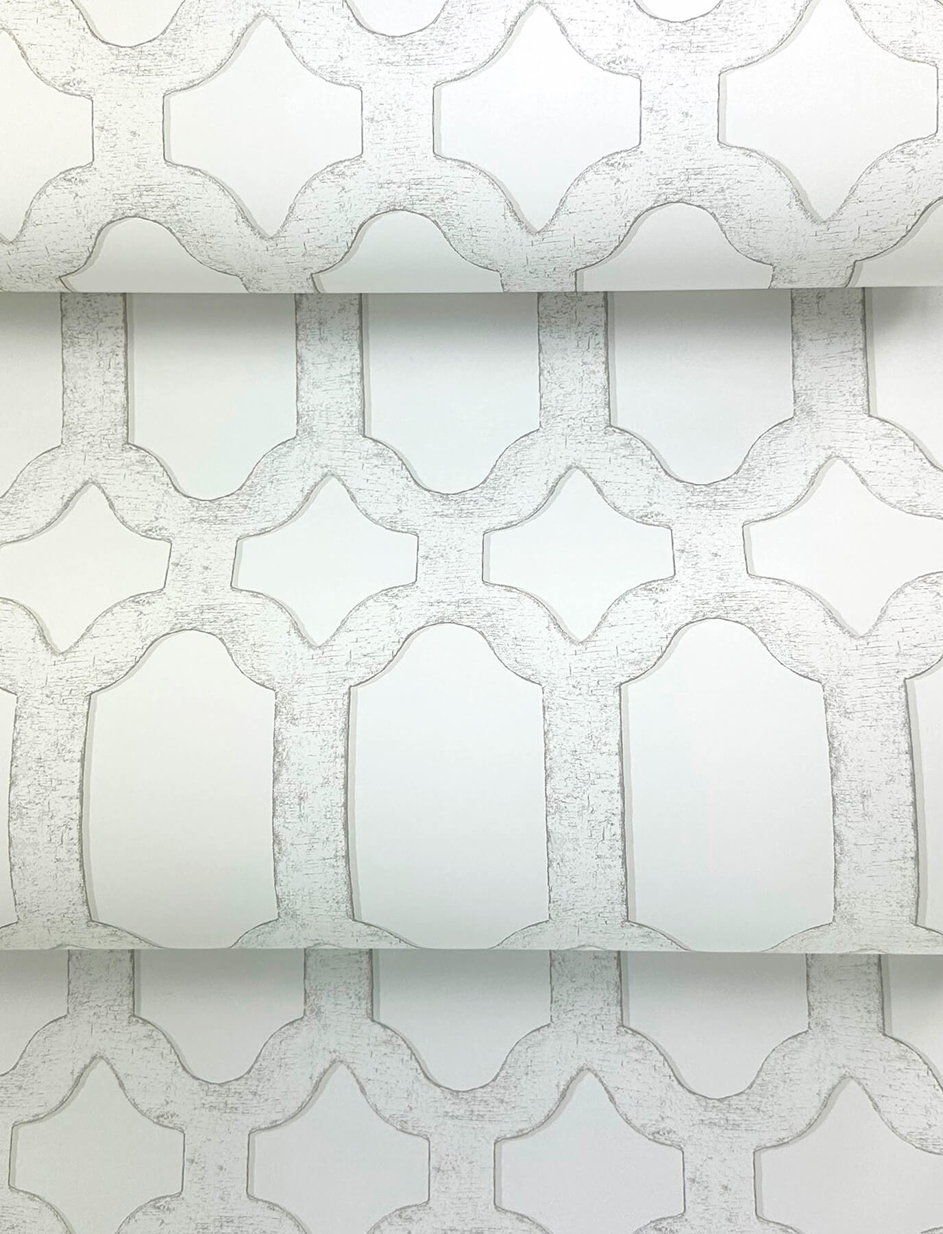 Inspired by antique fencing, this curving, quatrefoil trellis design features a [pale grey and antique white] finish imbued with weathered woodgrain detailing. Chervil is a prepasted, sure strip wallpaper measuring 20.5 inches wide by 33 feet long, covering approximately 56.4 square feet per roll. Inspired by the charming ambiance of herb filled gardens, Chesapeake Wildflower wallpaper collection features elegant botanical patterns, old world architectural motifs, and other vintage touches.