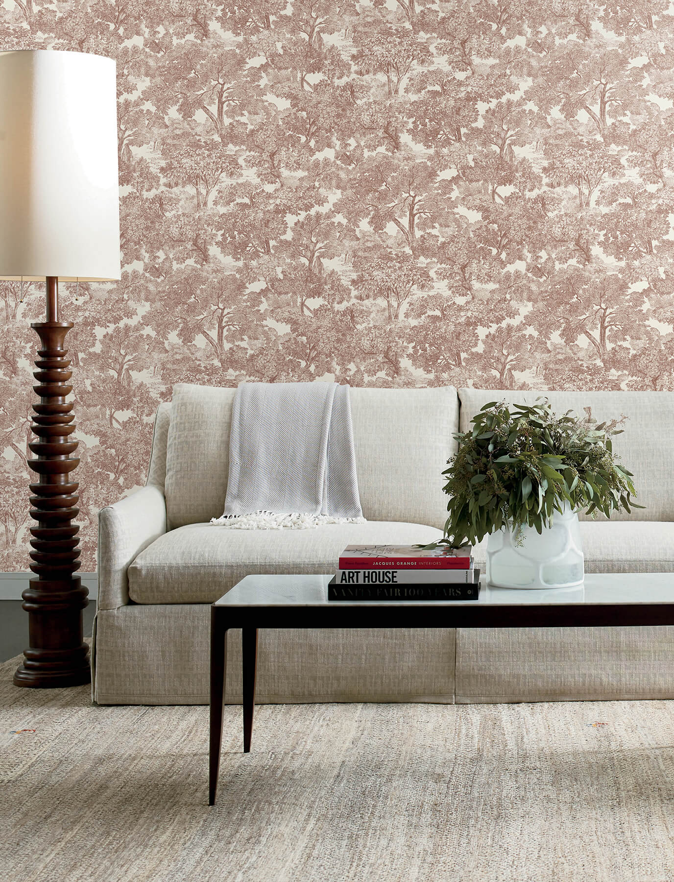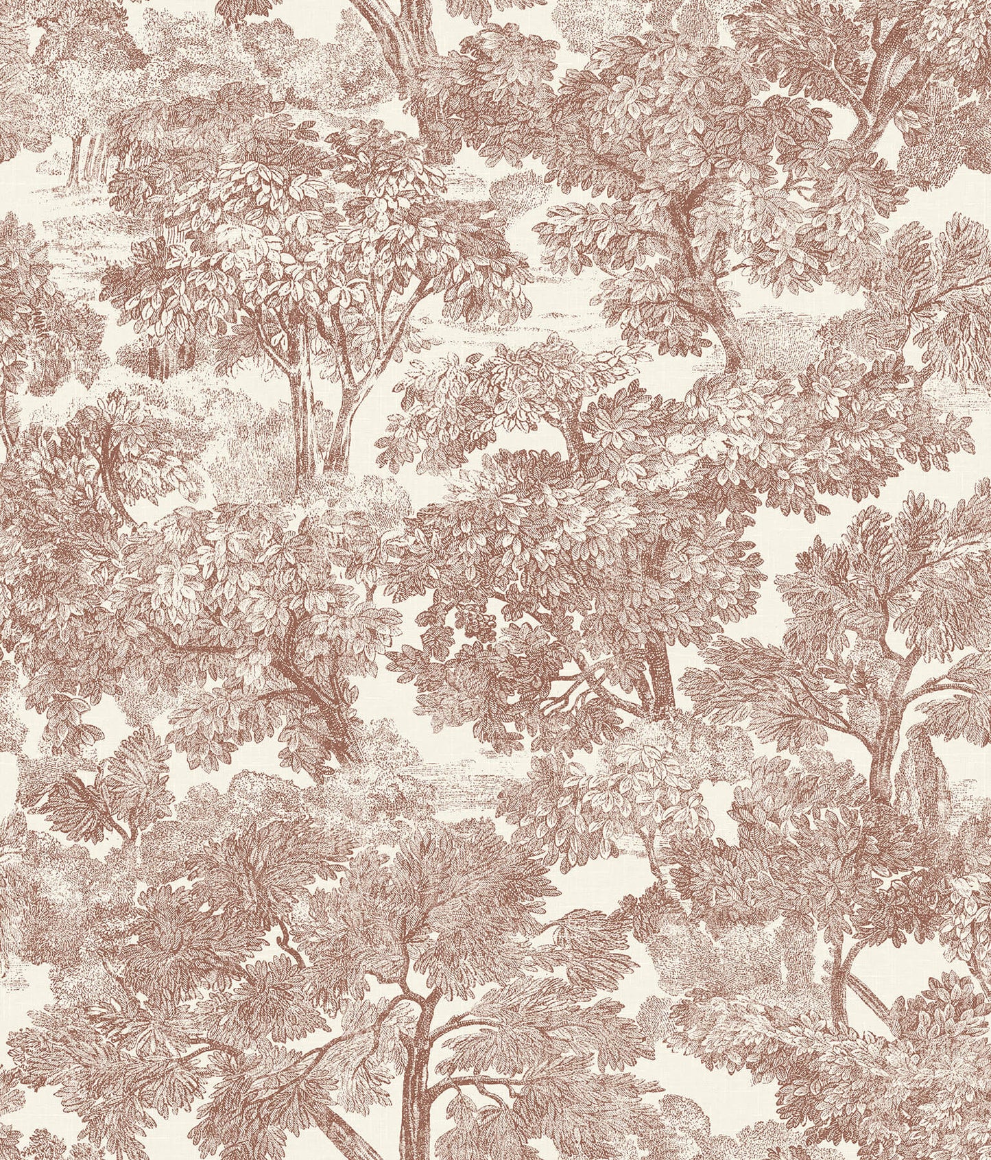 This iconic toile design features trees showcasing their fullest foliage, the details intricately illustrated in aged red ink. Spinney is a prepasted, sure strip wallpaper measuring 20.5 inches wide by 33 feet long, covering approximately 56.4 square feet per roll. Inspired by the charming ambiance of herb filled gardens, Chesapeake Wildflower wallpaper collection features elegant botanical patterns, old world architectural motifs, and other vintage touches.