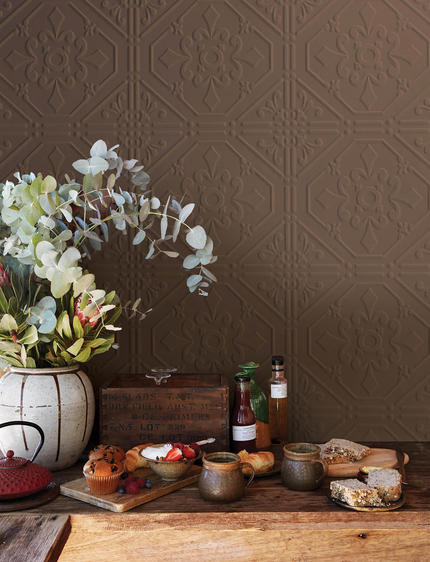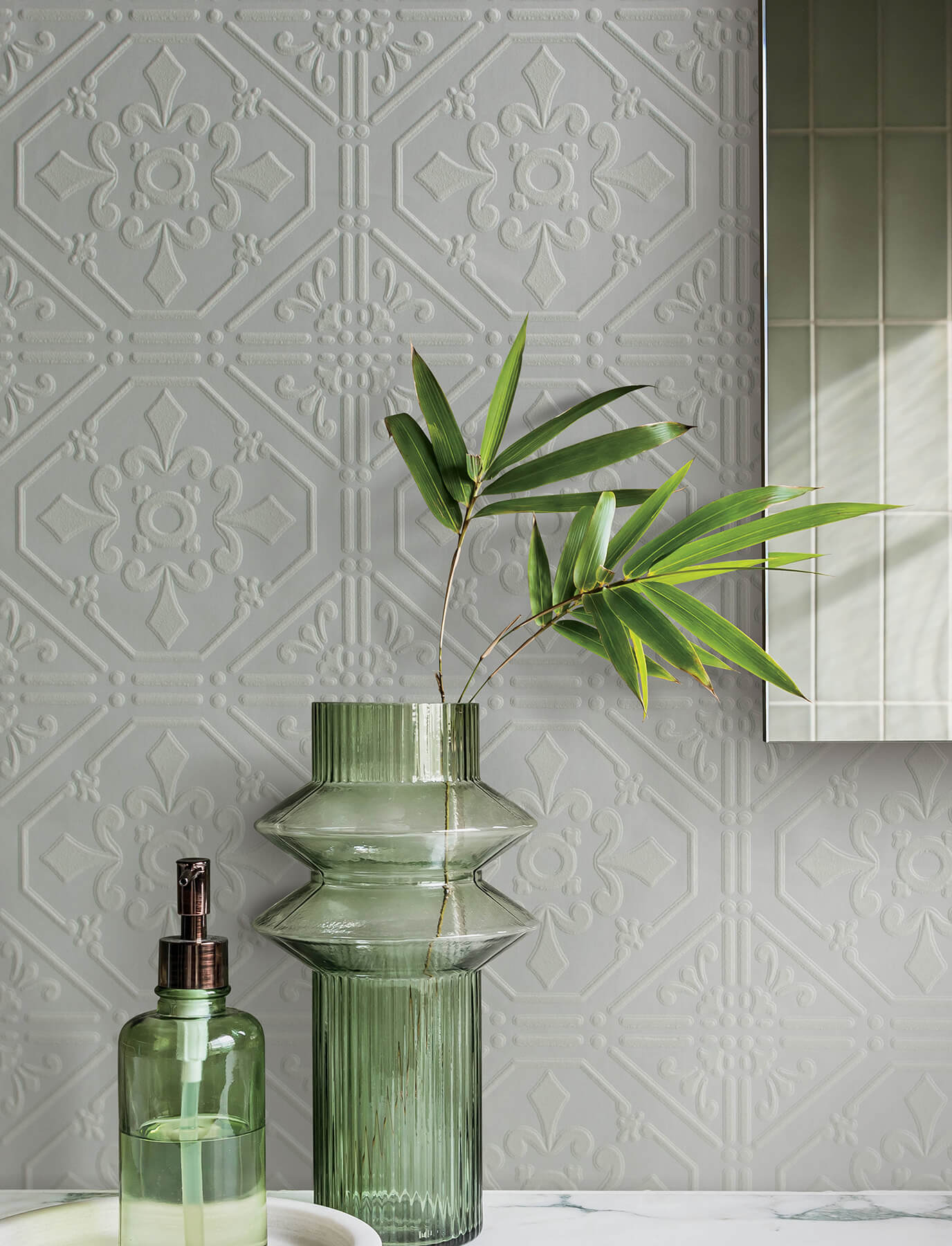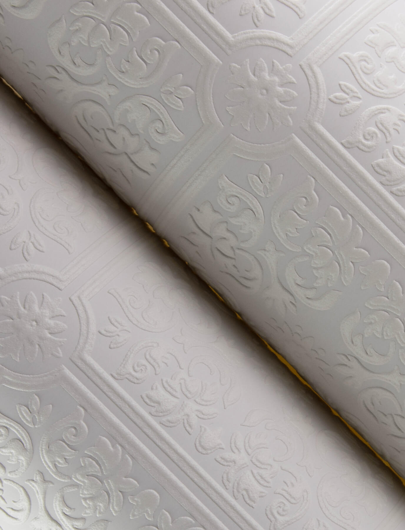 Inspired by antique tin tile ceilings, this ornate paintable wallpaper features raised, expanded vinyl botanical and geometric medallions. Brooklyn is a prepasted, expanded vinyl wallpaper measuring 20.9 inches wide by 33 feet long, covering approximately 57.5 square feet per roll. Inspired by the charming ambiance of herb filled gardens, Chesapeake Wildflower wallpaper collection features elegant botanical patterns, old world architectural motifs, and other vintage touches.