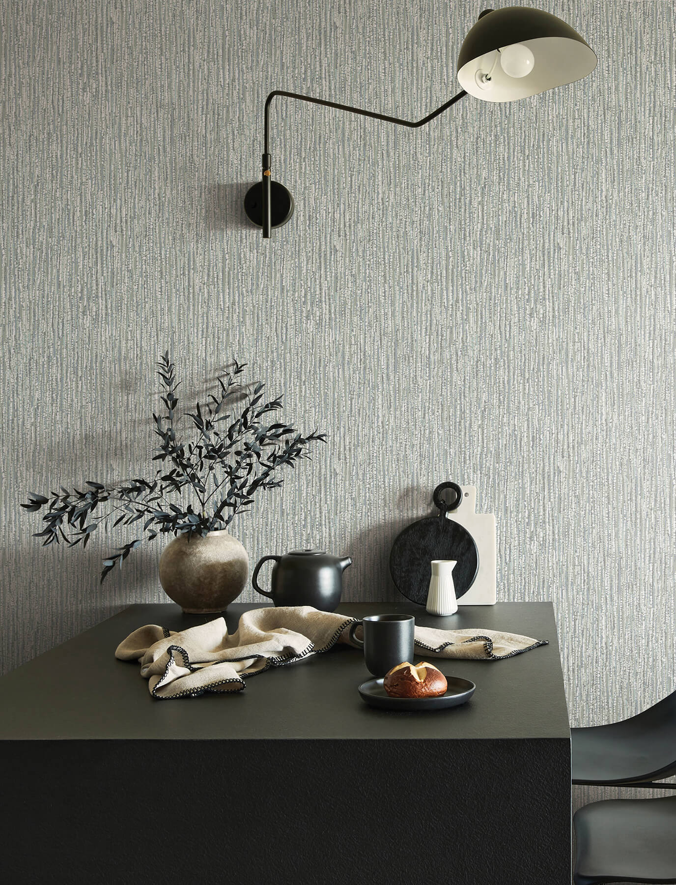 The layers of beaded strands in this modern wallpaper create a dimensional backdrop for your home. Each strand is composed of a singular color, the petite beads colored an array of greys, light blue, and white. Corliss is an unpasted, non woven wallpaper measuring 20.5 inches wide by 33 feet long, covering approximately 56.4 square feet per roll. Soothing and organic, Solace by A-Street Prints brings the tranquility of nature to your interiors. This wallpaper collection features a series of textural, free flowing forms in a curated palette of soft, earthy hues.
