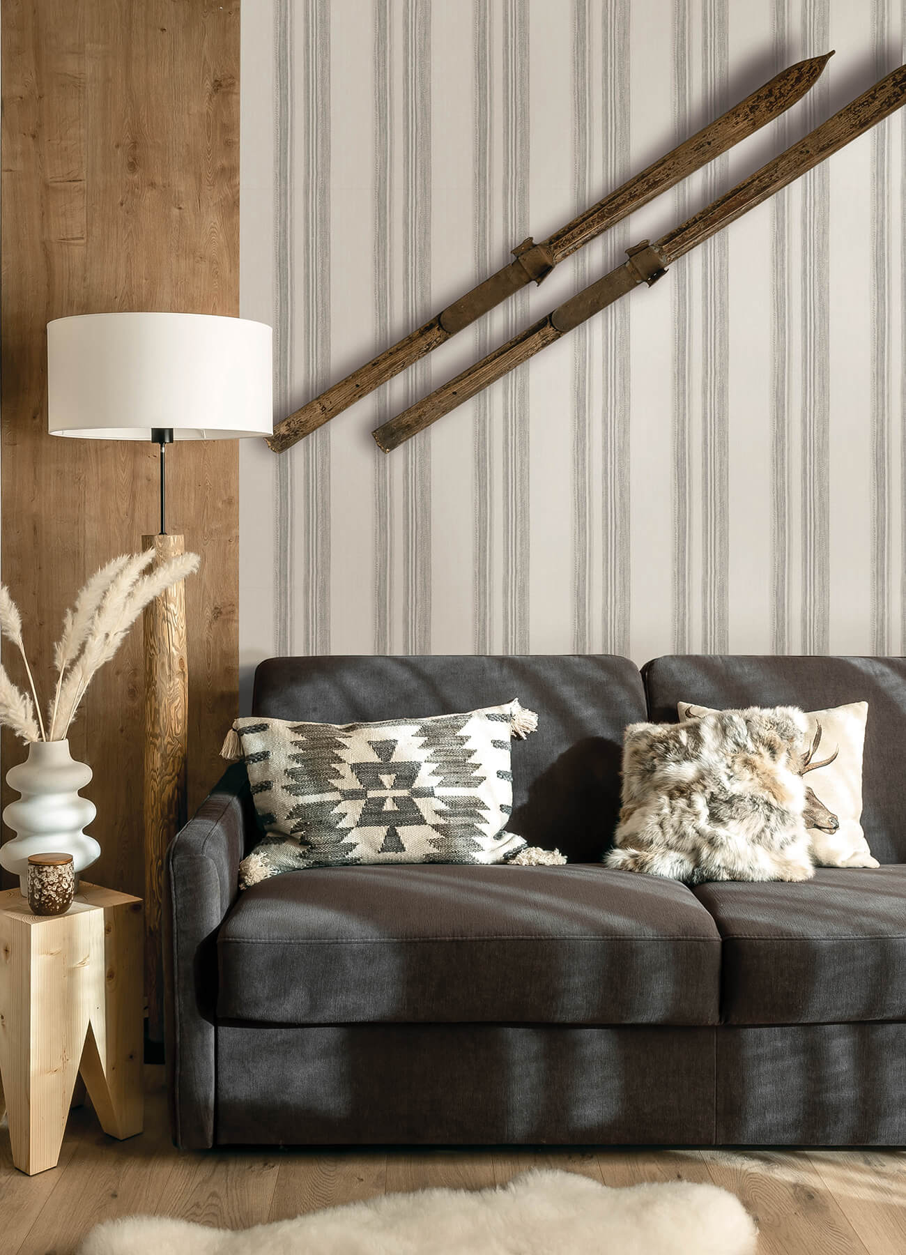 The appeal of stripes is as enduring as denim itself. This wallpaper features wide white stripes that alternate with groups of grey stripes that feature several shades and banding widths. Loom Spun is a prepasted, non woven wallpaper measuring 20.5 inches wide by 33 feet long, covering approximately About 56.4 square feet square feet per roll. Celebrate the rugged, yet sophisticated and fierce beauty of America's frontier lands with Yellowstone by Chesapeake. This wallpaper collection captures the hit Paramount Network series indomitable spirit through a variety of enduring, western designs.