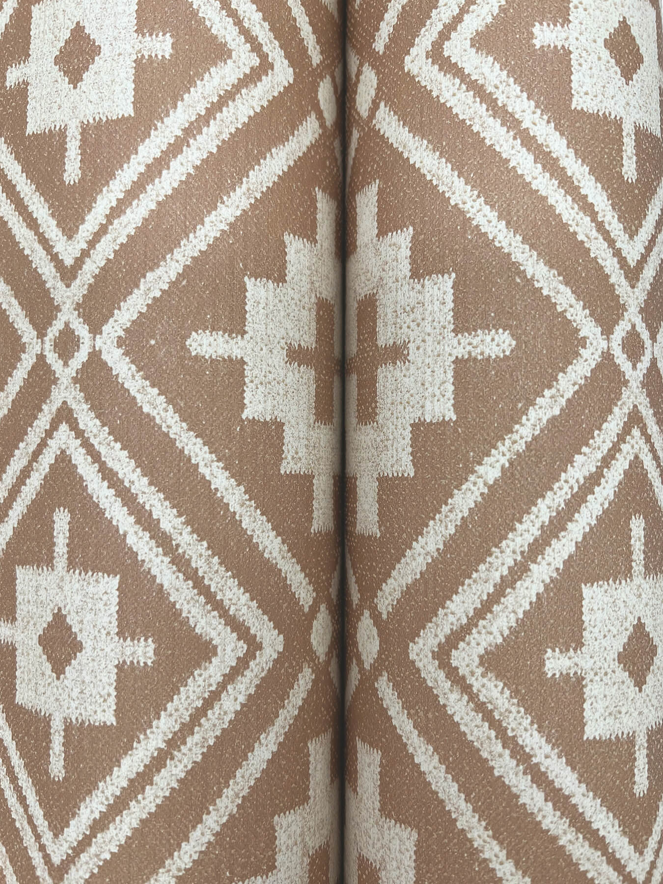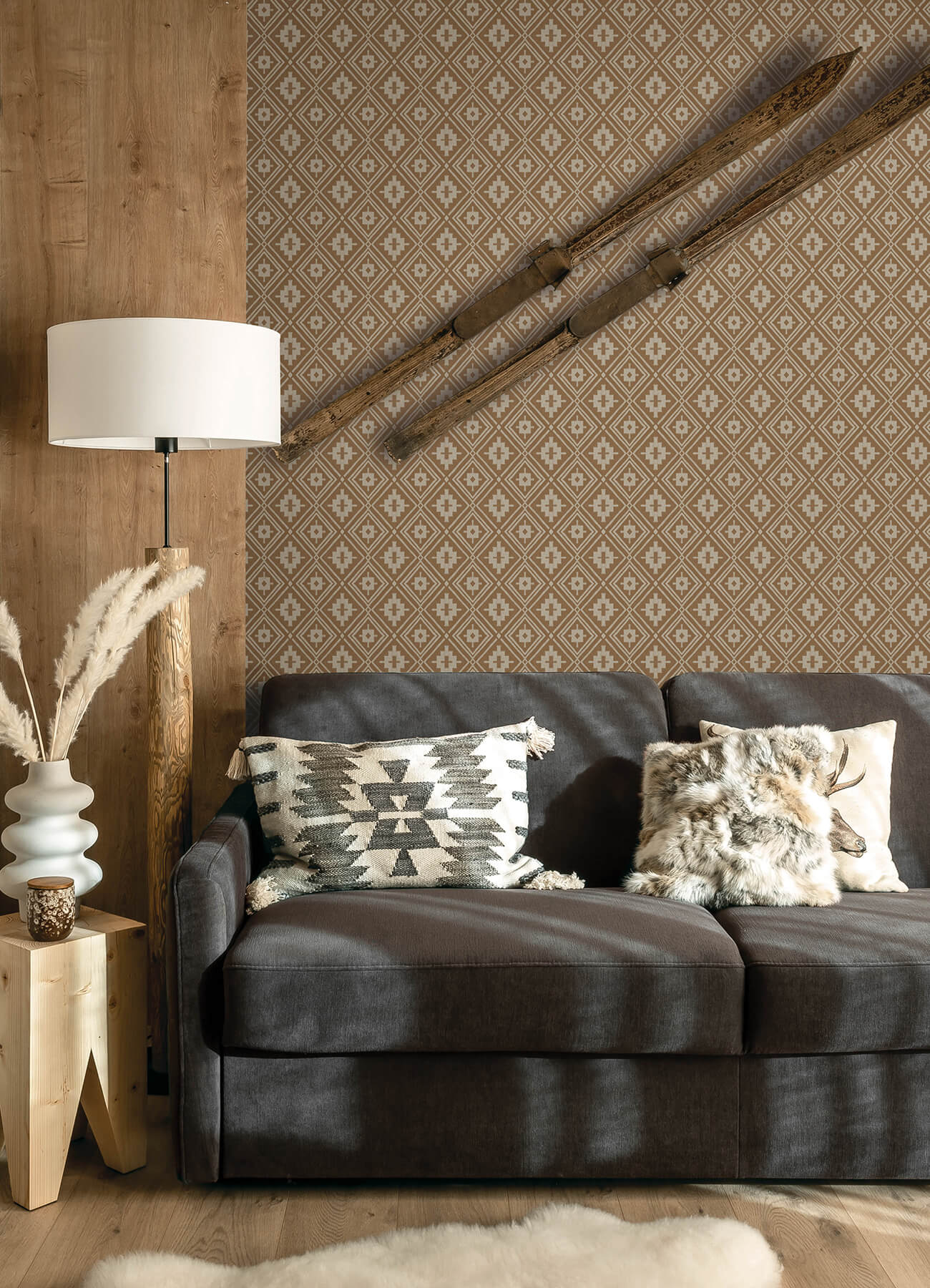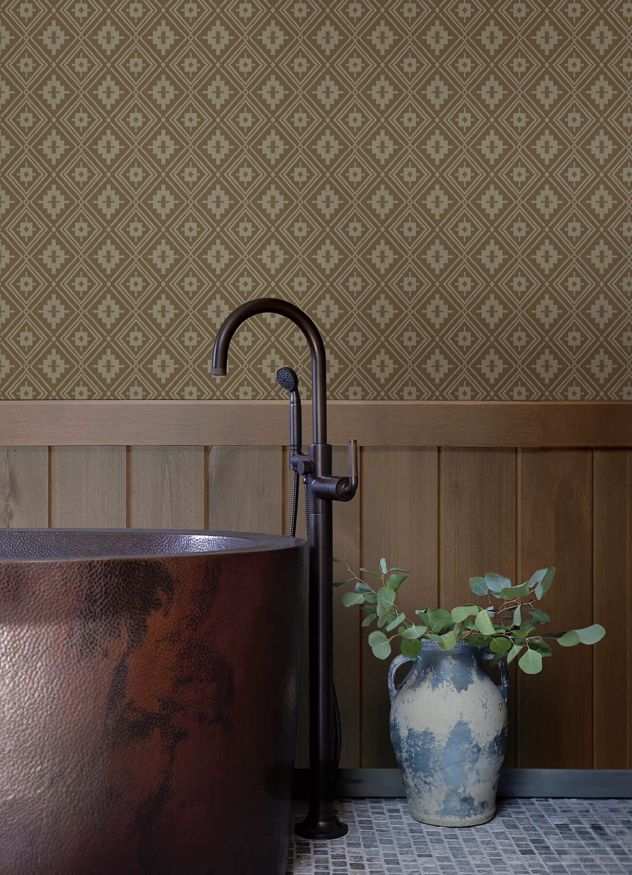 A diamond grid frames two styles of angular, western medallions in this two-tone design. The pattern is seemingly stitched in cream onto the earthen orange background, adding to the illusion of a well-worn throw blanket. Camp Blanket is a prepasted, non woven wallpaper measuring 20.5 inches wide by 33 feet long, covering approximately About 56.4 square feet square feet per roll. Celebrate the rugged, yet sophisticated and fierce beauty of America's frontier lands with Yellowstone by Chesapeake. This wallpaper collection captures the hit Paramount Network series indomitable spirit through a variety of enduring, western designs.