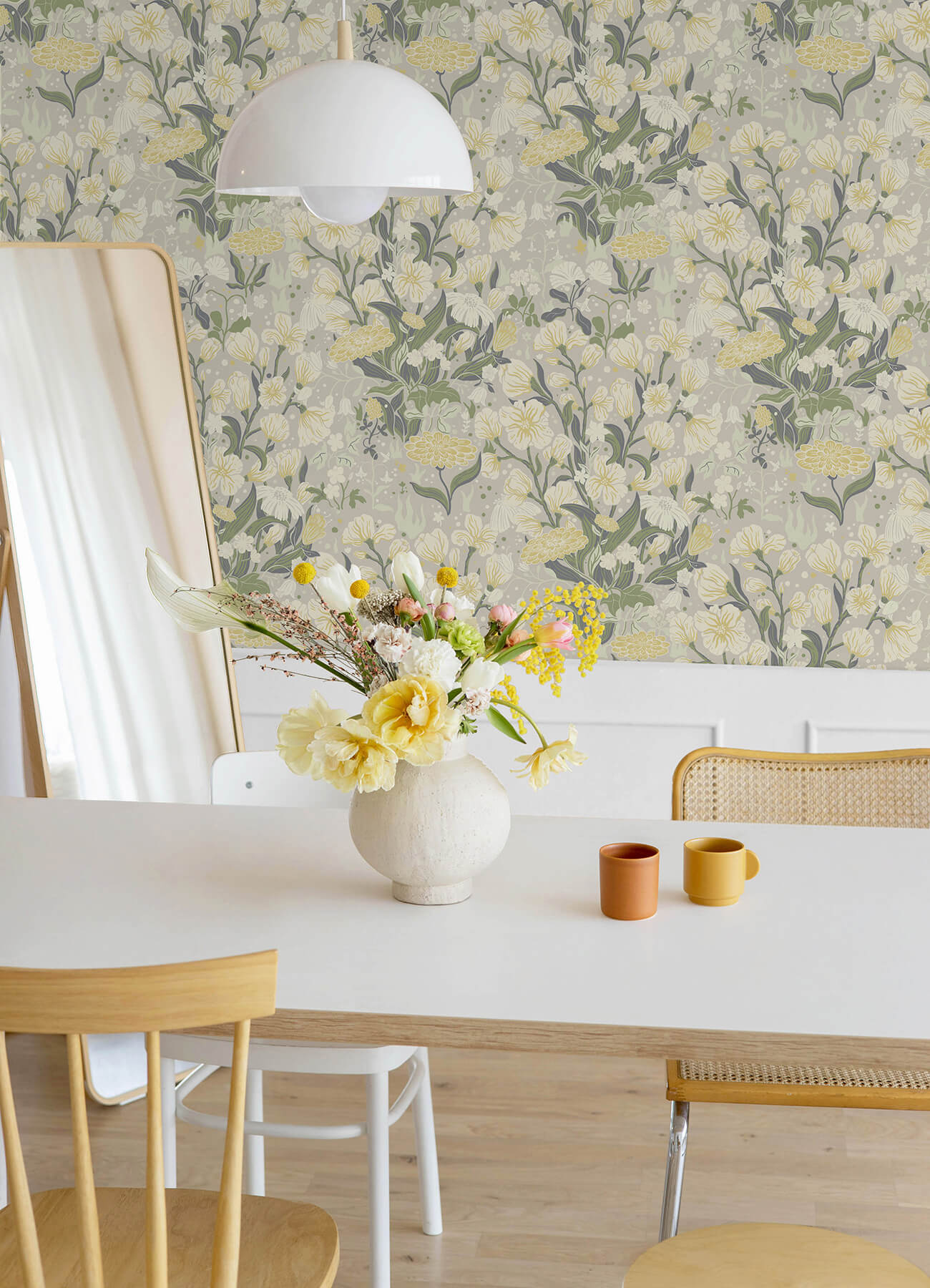This feminine floral wallpaper enjoys additional, delicate charms from its soft color palette. The illustrative design features an inviting blend of buttery yellow, antique white, pale mint, light green, and grey. Hava is an unpasted, non woven wallpaper measuring 20.9 inches wide by 33 feet long, covering approximately 57.5 square feet per roll. Bring the charm of a well tended garden to your interiors with Scandinavian inspired Botanica by A-Street Prints. A combination of lush floral and delicate, verdant designs embody the rich bounty of summertime, with color palettes that capture the distinct magic of the four seasons.