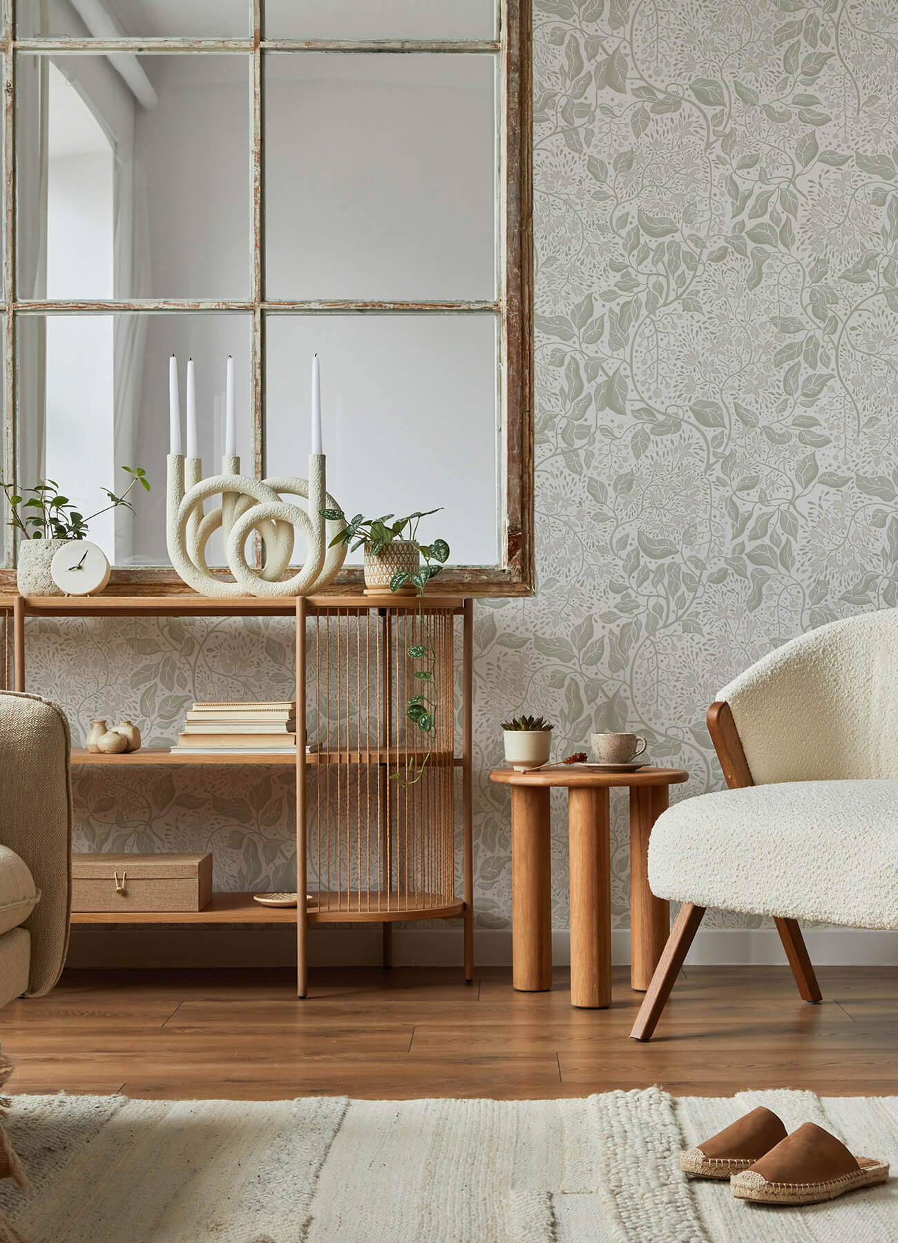 Spring's gentle touch is celebrated in this stunning botanical wallpaper. The illustrative design features winding sage vines bedecked in delicate, pale grey flowers and small berries. Turi is an unpasted, non woven wallpaper measuring 20.9 inches wide by 33 feet long, covering approximately 57.5 square feet per roll. Bring the charm of a well tended garden to your interiors with Scandinavian inspired Botanica by A-Street Prints. A combination of lush floral and delicate, verdant designs embody the rich bounty of summertime, with color palettes that capture the distinct magic of the four seasons.