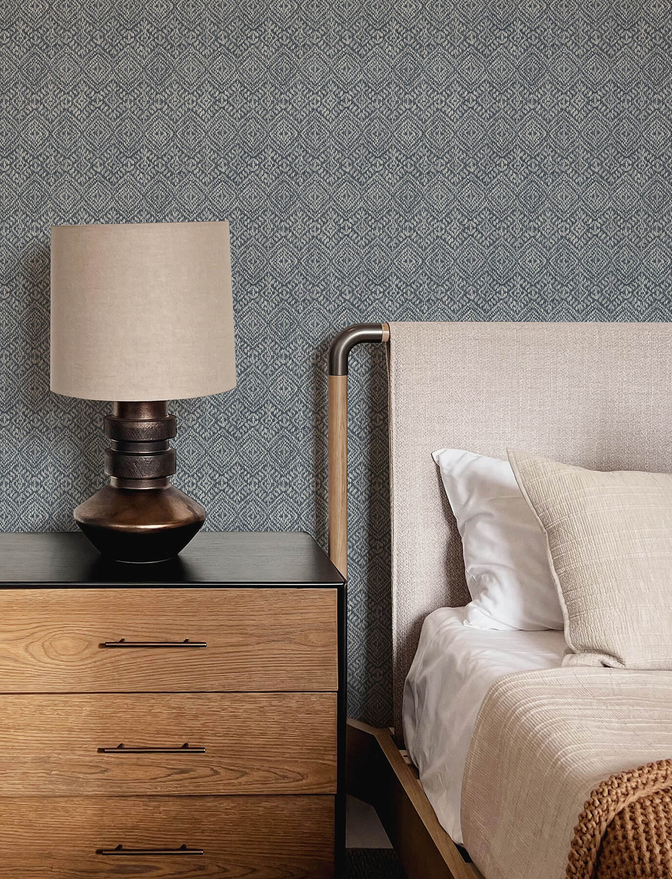 This mesmerizing geometric design mimics the knotted details of hand-woven tapestries. The intricate geometric design slowly unfurls in alternating denim and pale blue, a rough texture emulating the feel of wool. Gallivant is an unpasted, non woven wallpaper measuring 20.5 inches wide by 33 feet long, covering approximately 56.4 square feet per roll. Design inspiration from every corner of the globe can be found in Harmony by A-Street Prints. This cultured wallpaper collection features untamed nature motifs, intricate woven inspired geometrics, with vibrant and grounded color palettes.