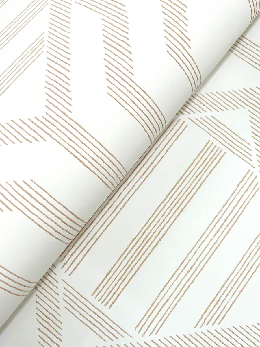 The impressive scale of this column-esque design is playfully contrasted by the hand-drawn lines that shape its geometric forms. Seen here with golden-brown linework against cool white. Essex is an unpasted, non woven wallpaper measuring 20.5 inches wide by 33 feet long, covering approximately 56.4 square feet per roll. Haberdashery by A-Street Prints re-imagines classic design with a modern twist. This stylish collection features timeless textile patterns, elegant geometrics, and lush botanicals, all enriched with warm and inviting color palettes.