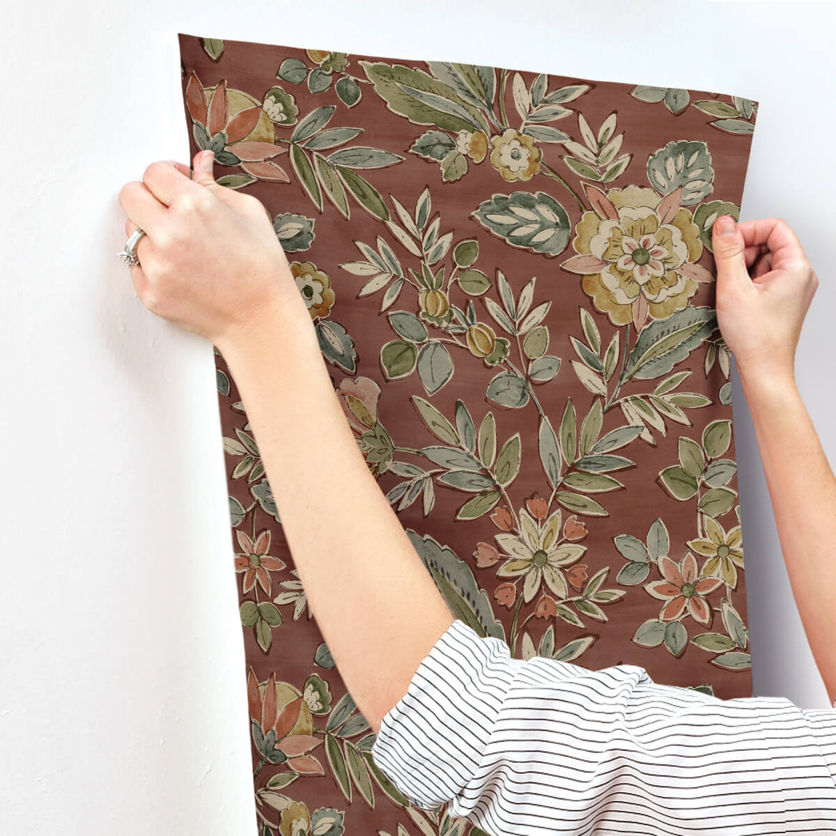 Twining vines are bedecked in voluminous floral blooms and delicate fruits, with free-flowing watercolors adding to the design's elegant charms. Rich and earthy greens, teals, ochres, and salmon are warmly offset by a russet background. Begonia is an unpasted, non woven wallpaper measuring 20.5 inches wide by 33 feet long, covering approximately 56.4 square feet per roll. Printworks by Chesapeake brings block print artistry back to life through a collection of classic and modern wallpaper designs. The collection includes coordinating trims and highlights traditional craftsmanship with contemporary appeal.