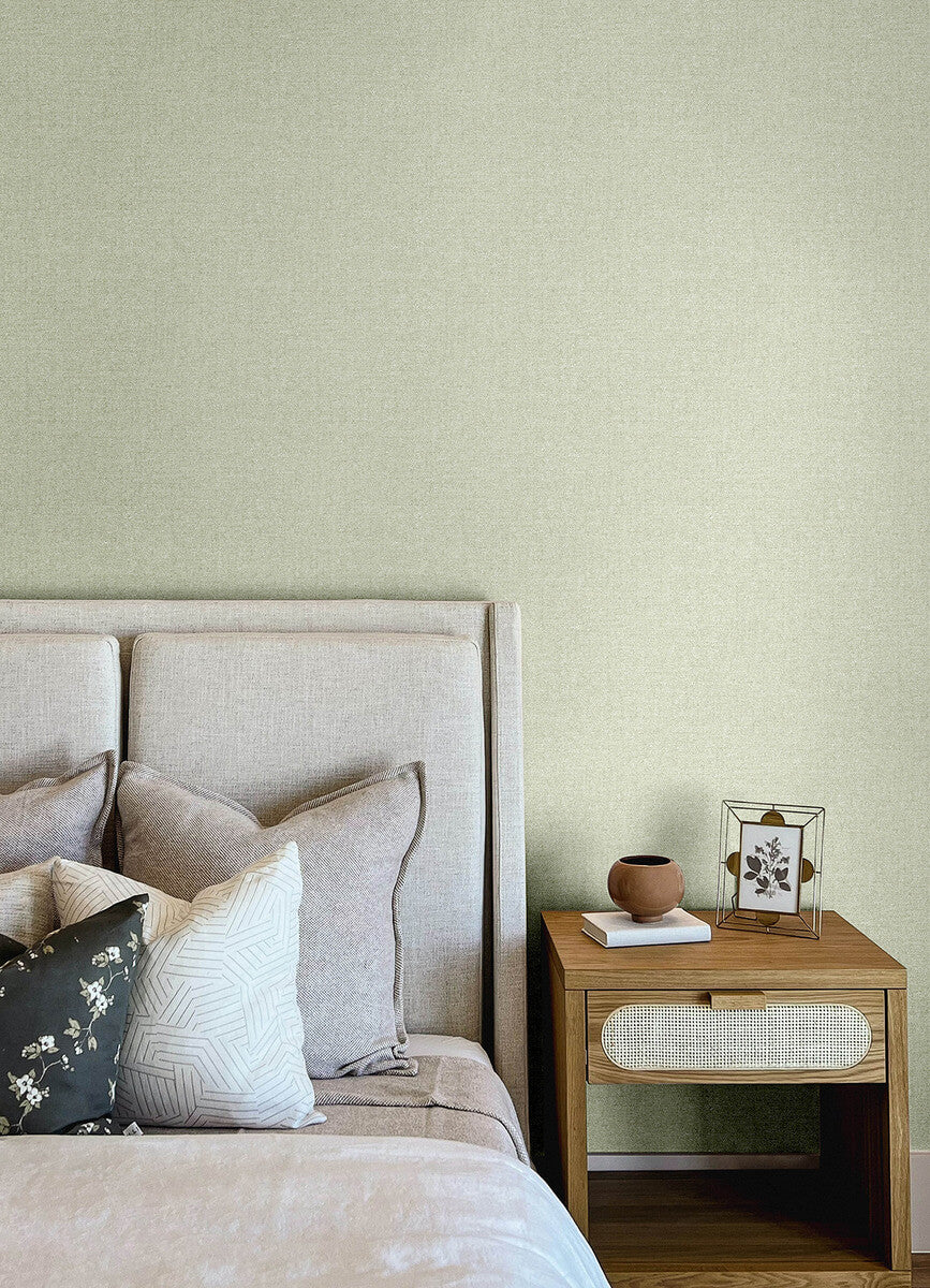 Soft washes of color are given greater complexity with woven detailing and a tactile hand. Seen here in soft sage. Kameez is an unpasted, non woven wallpaper measuring 20.5 inches wide by 33 feet long, covering approximately 56.4 square feet per roll. Printworks by Chesapeake brings block print artistry back to life through a collection of classic and modern wallpaper designs. The collection includes coordinating trims and highlights traditional craftsmanship with contemporary appeal.