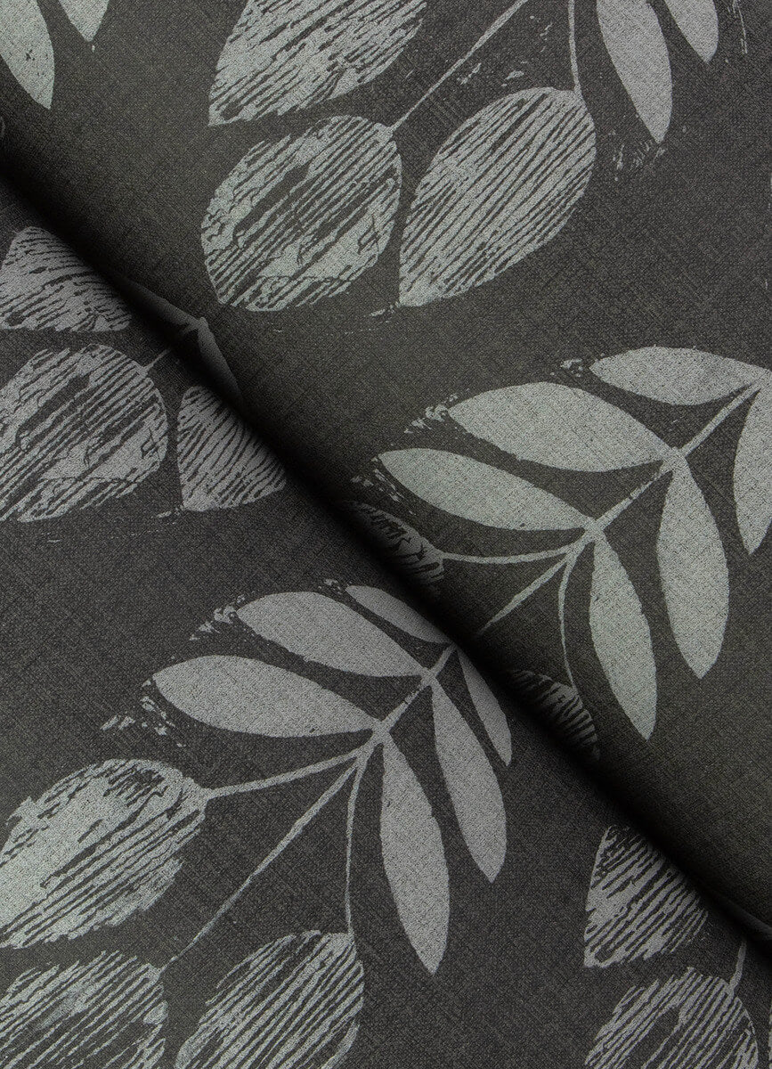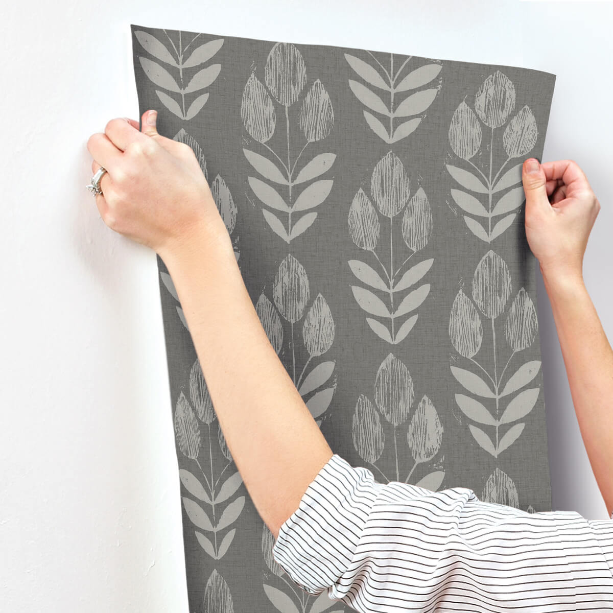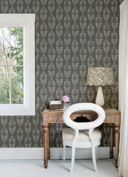 Earthen elegance at its finest, this botanical print features stylized light grey tulips printed along a charcoal backdrop imbued with woven linen detailing. Garland is an unpasted, non woven wallpaper measuring 20.5 inches wide by 33 feet long, covering approximately 56.4 square feet per roll. Printworks by Chesapeake brings block print artistry back to life through a collection of classic and modern wallpaper designs. The collection includes coordinating trims and highlights traditional craftsmanship with contemporary appeal.