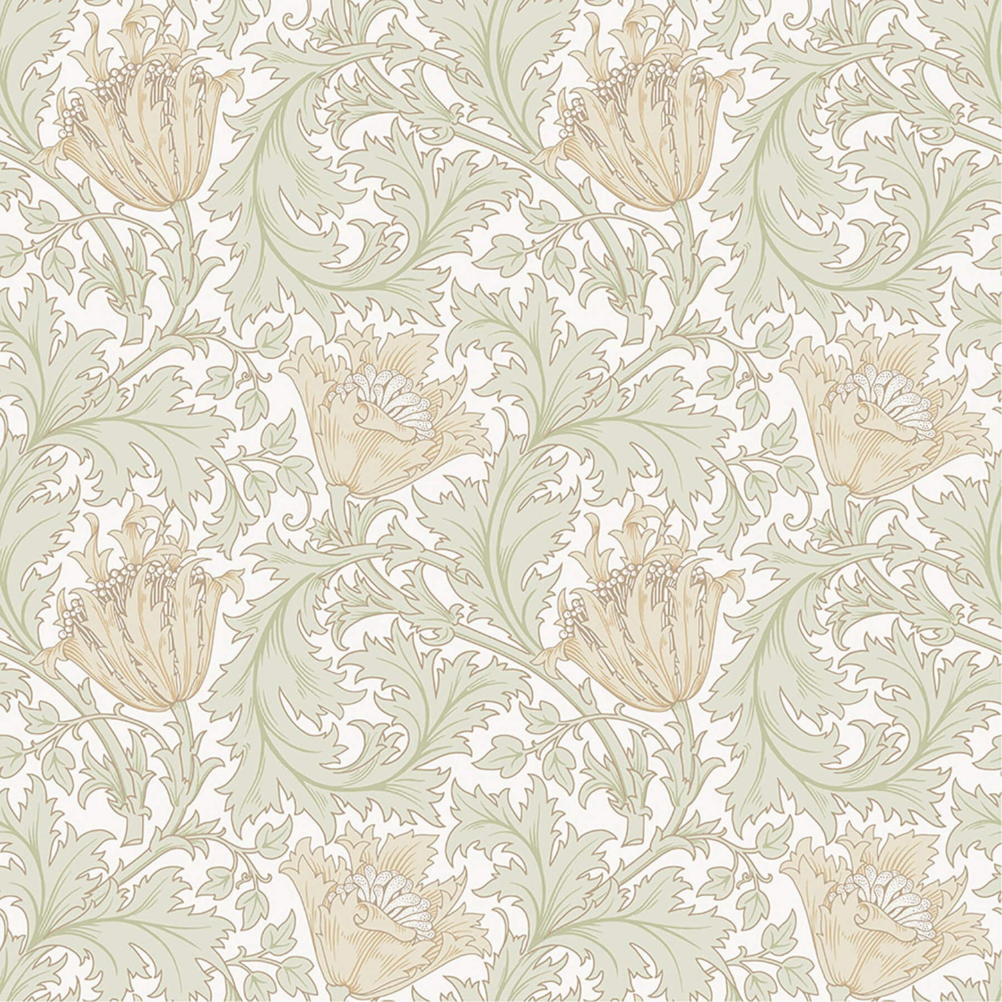 Reimagined from a late 1890’s sketch, pale gold anemone flowers intricately weave their way through a sea of sage green scalloped leaves outlined in copper-brown against a creamy white backdrop. Anemone is an unpasted, non woven wallpaper measuring 20.9 inches wide by 33 feet long, covering approximately 57.5 square feet per roll. Celebrating Morris' lifelong love of nature, the Hidden Treasures wallpaper collection does much more than amplify echoes from the past. It transforms them into elegant interior design classics that add distinct character to the walls of any home. Although it's well over 100 years since he passed, iconic English designer William Morris continues to have a profound influence on contemporary design. With Hidden Treasures, a series of previously unseen Morris sketches have been faithfully recreated by acclaimed Swedish designer Björn Nilsson.