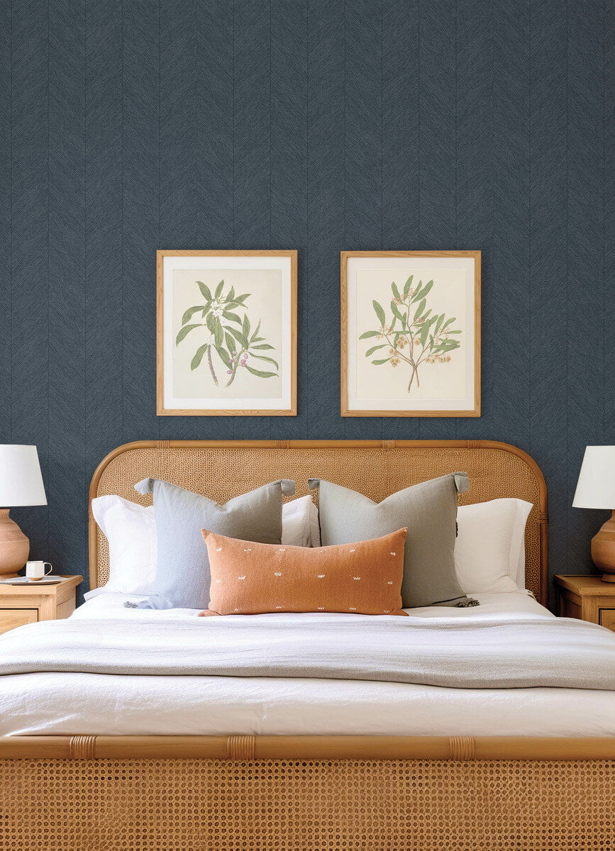 Delicately stippled raised ink lines along a pearlescent ground raises chevron design to the peak of sophistication. Featured here in lustrous indigo. Kallam is an unpasted, non woven wallpaper measuring 20.5 inches wide by 33 feet long, covering approximately About 56.4 square feet square feet per roll. In its fourth wallpaper collection, Drew & Jonathan Home celebrates the signature casual and refined style of Drew & Jonathan Scott who help you re-imagine what's possible in your space through a modern assortment of geometric and nature inspired designs in a variety of elevated finishes.